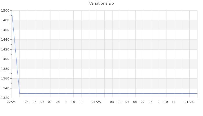 Date d'inscription : 28/02/24. Donateur pour EchecsEmail : Non ( Cliquez ici pour soutenir EchecsEmail. ) Elo non arrondi:1292.5 ( 478 sur 448 joueurs ) Nombre de victoires :0 Nombre de nulles :0 Nombre de défaites :2 Temps de réponse moyen par coup : 0J 0H 33M 0S ( Moyenne sur 0 coups ). Rd ( Un petit rd indique un elo fiable ) : 222 Elo maximum atteint ( en étant classé ) :0 Elo maximum atteint cette année :0 Nombre coups joués : 25 Classement coupe : Inactif Points coupe : 0 Classement Coupe Magic Chess : Inactif Points Coupe Magic Chess : 0 Tournoi échelle : Nombre de tournois gagnés :0