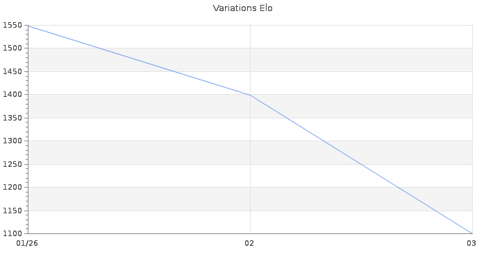Date d'inscription : 31/01/26. Donateur pour EchecsEmail : Non ( Cliquez ici pour soutenir EchecsEmail. ) Elo non arrondi:1102.7 ( 436 sur 444 joueurs ) Nombre de victoires :1 Nombre de nulles :0 Nombre de défaites :15 Temps de réponse moyen par coup : 2J 6H 14M 15S ( Moyenne sur 67 coups ). Rd ( Un petit rd indique un elo fiable ) : 99 Elo maximum atteint ( en étant classé ) :1280 Elo maximum atteint cette année :1280 Nombre coups joués : 100 Classement coupe : Inactif Points coupe : 0 Classement Coupe Magic Chess : Inactif Points Coupe Magic Chess : 0 Tournoi échelle : Nombre de tournois gagnés :0