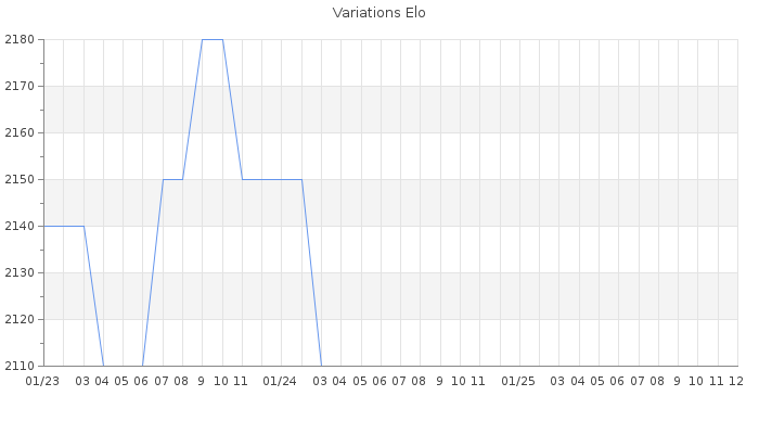 Date d'inscription : 30/11/15. Donateur pour EchecsEmail : Non ( Cliquez ici pour soutenir EchecsEmail. ) Elo non arrondi:2080.4 ( 105 sur 448 joueurs ) Nombre de victoires :106 Nombre de nulles :15 Nombre de défaites :76 Temps de réponse moyen par coup : 0J 20H 32M 1S ( Moyenne sur 0 coups ). Rd ( Un petit rd indique un elo fiable ) : 128 Elo maximum atteint ( en étant classé ) :2220 Elo maximum atteint cette année :0 Nombre coups joués : 6873 Classement coupe : Inactif Points coupe : 0 Classement Coupe Magic Chess : Inactif Points Coupe Magic Chess : 0 Tournoi échelle : Inactif. Nombre de tournois gagnés :0