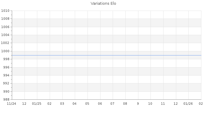 Date d'inscription : 30/11/24. Donateur pour EchecsEmail : Non ( Cliquez ici pour soutenir EchecsEmail. ) Elo non arrondi:972 ( 492 sur 458 joueurs ) Nombre de victoires :0 Nombre de nulles :0 Nombre de défaites :2 Temps de réponse moyen par coup : 0J 5H 11M 12S ( Moyenne sur 0 coups ). Rd ( Un petit rd indique un elo fiable ) : 291 Magic Elo:1700 Magic Rd : 350 Elo maximum atteint ( en étant classé ) :0 Elo maximum atteint cette année :0 Nombre coups joués : 11 Classement coupe : Inactif Points coupe : 0 Classement Coupe Magic Chess : Inactif Points Coupe Magic Chess : 0 Tournoi échelle : Nombre de tournois gagnés :0