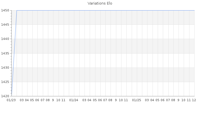 Date d'inscription : 10/12/22. Donateur pour EchecsEmail : Non ( Cliquez ici pour soutenir EchecsEmail. ) Elo non arrondi:1418.2 ( 467 sur 448 joueurs ) Nombre de victoires :10 Nombre de nulles :0 Nombre de défaites :5 Rd ( Un petit rd indique un elo fiable ) : 102 Elo maximum atteint ( en étant classé ) :1510 Elo maximum atteint cette année :0 Nombre coups joués : 474 Classement coupe : Inactif Points coupe : 0 Classement Coupe Magic Chess : Inactif Points Coupe Magic Chess : 0 Tournoi échelle : Nombre de tournois gagnés :0