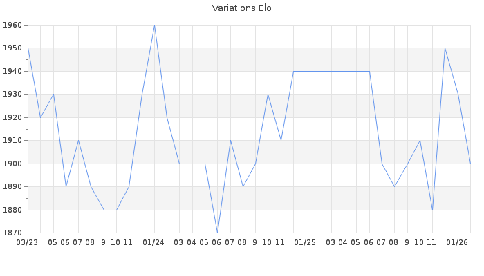 Date d'inscription : 03/08/08. Donateur pour EchecsEmail : Non ( Cliquez ici pour soutenir EchecsEmail. ) Elo non arrondi:1900.8 ( 180 sur 459 joueurs ) Nombre de victoires :1620 Nombre de nulles :531 Nombre de défaites :1440 Temps de réponse moyen par coup : 0J 2H 51M 42S ( Moyenne sur 1074 coups ). Rd ( Un petit rd indique un elo fiable ) : 66 Magic Elo:1821.27 Magic Rd : 239 Elo maximum atteint ( en étant classé ) :2060 Elo maximum atteint cette année :1930 Nombre coups joués : 137112 Inscrit dans l' équipe:au plaisir du jeux Classement coupe : Inactif Points coupe : 0 Classement Coupe Magic Chess : Inactif Points Coupe Magic Chess : 0 Tournoi échelle : Inactif. Tournois gagnés : 24/06/2024 : Cat 3 : Victoire dans le tournoi n°25886 23/01/2023 : Cat 4 : Victoire dans le tournoi n°24539 15/01/2023 : Cat 4 : Victoire dans le tournoi n°24532 22/12/2022 : Cat 3 : Victoire dans le tournoi n°24503 04/09/2022 : Cat 4 : Victoire dans le tournoi n°24177 28/02/2022 : Cat 3 : Victoire dans le tournoi n°23636 04/02/2022 : Cat 3 : Victoire dans le tournoi n°23614 02/04/2020 : Cat 3 : Victoire dans le tournoi n°21036 18/02/2020 : Cat 3 : Victoire dans le tournoi n°20768 18/11/2019 : Cat 3 : Victoire dans le tournoi n°20435 05/03/2018 : Cat 4 : Victoire dans le tournoi n°17716 29/01/2018 : Cat 3 : Victoire dans le tournoi n°17678 05/08/2017 : Cat 4 : Victoire dans le tournoi n°16785 14/02/2017 : Cat 4 : Victoire dans le tournoi n°16035 11/01/2017 : Cat 4 : Victoire dans le tournoi n°15984 03/01/2017 : Cat 3 : Victoire dans le tournoi n°15909 21/02/2016 : Cat 4 : Victoire dans le tournoi n°14294 24/09/2015 : Cat 3 : Victoire dans le tournoi n°18401 01/12/2014 : Cat 3 : Victoire dans le tournoi n°16560 25/11/2014 : Cat 3 : Victoire dans le tournoi n°16515 25/08/2014 : Cat 4 : Victoire dans le tournoi n°15852 31/07/2014 : Cat 3 : Victoire dans le tournoi n°15599 25/07/2014 : Cat 3 : Victoire dans le tournoi n°15667 09/04/2014 : Cat 3 : Victoire dans le tournoi n°14961 19/02/2014 : Cat 4 : Victoire dans le tournoi n°14509 13/01/2014 : Cat 3 : Victoire dans le tournoi n°14100 29/12/2013 : Cat 3 : Victoire dans le tournoi n°14167 26/12/2013 : Cat 3 : Victoire dans le tournoi n°14248 26/12/2013 : Cat 3 : Victoire dans le tournoi n°14136 20/10/2013 : Cat 3 : Victoire dans le tournoi n°13462 09/09/2013 : Cat 3 : Victoire dans le tournoi n°13115 17/08/2013 : Cat 4 : Victoire dans le tournoi n°12928 02/08/2013 : Cat 4 : Victoire dans le tournoi n°12859 29/10/2012 : Cat 4 : Victoire dans le tournoi n°10765 02/09/2012 : Cat 4 : Victoire dans le tournoi n°10692 06/08/2012 : Cat 3 : Victoire dans le tournoi n°10581 12/06/2012 : Cat 3 : Victoire dans le tournoi n°10448 07/06/2012 : Cat 4 : Victoire dans le tournoi n°10373 18/05/2012 : Cat 3 : Victoire dans le tournoi n°10303 28/07/2011 : Cat 3 : Victoire dans le tournoi n°8702 20/07/2011 : Cat 3 : Victoire dans le tournoi n°8945 08/07/2011 : Cat 3 : Victoire dans le tournoi n°8889 01/03/2011 : Cat 3 : Victoire dans le tournoi n°8225 13/02/2011 : Cat 3 : Victoire dans le tournoi n°8306 08/01/2011 : Cat 3 : Victoire dans le tournoi n°8161 02/11/2010 : Cat 3 : Victoire dans le tournoi n°7946 02/11/2010 : Cat 3 : Victoire dans le tournoi n°7892 27/09/2010 : Cat 3 : Victoire dans le tournoi n°7768 02/04/2010 : Cat 3 : Victoire dans le tournoi n°7053 22/01/2010 : Cat 3 : Victoire dans le tournoi n°6885 02/12/2009 : Cat 3 : Victoire dans le tournoi n°6663 28/06/2009 : Cat 2 : Victoire dans le tournoi n°5984 03/06/2009 : Cat 2 : Victoire dans le tournoi n°5951 02/06/2009 : Cat 2 : Victoire dans le tournoi n°5859 05/11/2008 : Cat 1 : Victoire dans le tournoi n°5245 Nombre de tournois gagnés :55