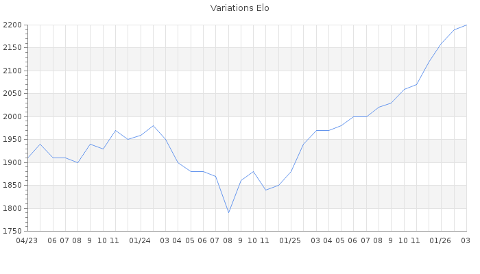 Date d'inscription : 31/12/21. Donateur pour EchecsEmail : Non ( Cliquez ici pour soutenir EchecsEmail. ) Elo non arrondi:2201.7 ( 62 sur 440 joueurs ) Nombre de victoires :211 Nombre de nulles :30 Nombre de défaites :185 Temps de réponse moyen par coup : 0J 3H 15M 58S ( Moyenne sur 378 coups ). Rd ( Un petit rd indique un elo fiable ) : 76 Magic Elo:1700 Magic Rd : 350 Elo maximum atteint ( en étant classé ) :2200 Elo maximum atteint cette année :2200 Nombre coups joués : 15129 Inscrit dans l' équipe:au plaisir du jeux Classement coupe : 170 Points coupe : 0.68 Classement Coupe Magic Chess : Inactif Points Coupe Magic Chess : 0 Tournoi échelle : Inactif. Tournois gagnés : 12/11/2024 : Cat 3 : Victoire dans le tournoi n°26048 13/11/2023 : Cat 4 : Premier au tournoi multi Halloween 2023 n°4 Nombre de tournois gagnés :3