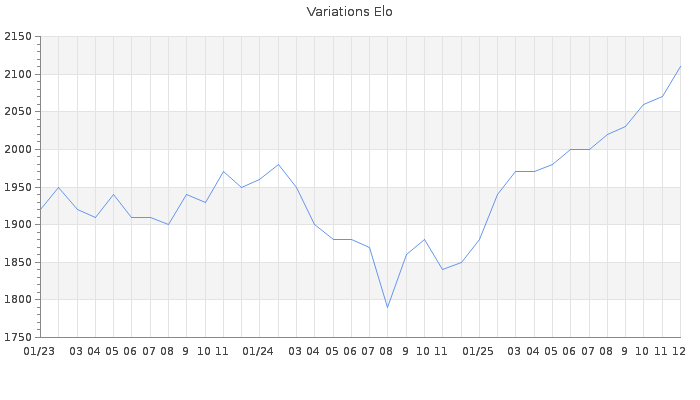 Date d'inscription : 31/12/21. Donateur pour EchecsEmail : Non ( Cliquez ici pour soutenir EchecsEmail. ) Elo non arrondi:2105.3 ( 85 sur 452 joueurs ) Nombre de victoires :197 Nombre de nulles :28 Nombre de défaites :183 Temps de réponse moyen par coup : 0J 4H 15M 59S ( Moyenne sur 571 coups ). Rd ( Un petit rd indique un elo fiable ) : 69 Magic Elo:1700 Magic Rd : 350 Elo maximum atteint ( en étant classé ) :2120 Elo maximum atteint cette année :2120 Nombre coups joués : 14611 Inscrit dans l' équipe:au plaisir du jeux Classement coupe : 180 Points coupe : 0.8 Classement Coupe Magic Chess : Inactif Points Coupe Magic Chess : 0 Tournoi échelle : Inactif. Tournois gagnés : 12/11/2024 : Cat 3 : Victoire dans le tournoi n°26048 13/11/2023 : Cat 4 : Premier au tournoi multi Halloween 2023 n°4 Nombre de tournois gagnés :3