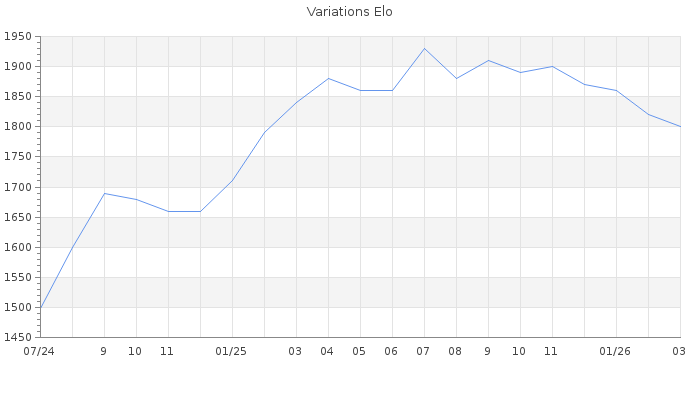 Date d'inscription : 12/07/24. Donateur pour EchecsEmail : Non ( Cliquez ici pour soutenir EchecsEmail. ) Elo non arrondi:1801.9 ( 224 sur 447 joueurs ) Nombre de victoires :72 Nombre de nulles :11 Nombre de défaites :48 Temps de réponse moyen par coup : 0J 4H 4M 19S ( Moyenne sur 526 coups ). Rd ( Un petit rd indique un elo fiable ) : 73 Magic Elo:1700 Magic Rd : 350 Elo maximum atteint ( en étant classé ) :1940 Elo maximum atteint cette année :1860 Nombre coups joués : 5342 Inscrit dans l' équipe:LechiquierDesHurlus Classement coupe : Inactif Points coupe : 0 Classement Coupe Magic Chess : Inactif Points Coupe Magic Chess : 0 Tournoi échelle : Inactif. Nombre de tournois gagnés :0