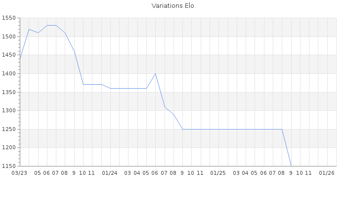 Date d'inscription : 27/04/21. Donateur pour EchecsEmail : Non ( Cliquez ici pour soutenir EchecsEmail. ) Elo non arrondi:1142.4 ( 450 sur 463 joueurs ) Nombre de victoires :246 Nombre de nulles :12 Nombre de défaites :280 Temps de réponse moyen par coup : 0J 8H 58M 32S ( Moyenne sur 5 coups ). Rd ( Un petit rd indique un elo fiable ) : 122 Elo maximum atteint ( en étant classé ) :1540 Elo maximum atteint cette année :0 Nombre coups joués : 20055 Classement coupe : Inactif Points coupe : 0.34 Classement Coupe Magic Chess : Inactif Points Coupe Magic Chess : 0 Tournoi échelle : Inactif. Tournois gagnés : 31/10/2022 : Cat 1 : Victoire dans le tournoi n°24310 20/12/2021 : Cat 1 : Victoire dans le tournoi n°23447 07/09/2021 : Cat 2 : Victoire dans le tournoi n°23006 Nombre de tournois gagnés :3