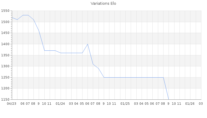 Date d'inscription : 27/04/21. Donateur pour EchecsEmail : Non ( Cliquez ici pour soutenir EchecsEmail. ) Elo non arrondi:1137.4 ( 450 sur 438 joueurs ) Nombre de victoires :246 Nombre de nulles :12 Nombre de défaites :280 Temps de réponse moyen par coup : 0J 8H 58M 32S ( Moyenne sur 3 coups ). Rd ( Un petit rd indique un elo fiable ) : 122 Elo maximum atteint ( en étant classé ) :1540 Elo maximum atteint cette année :0 Nombre coups joués : 20055 Classement coupe : Inactif Points coupe : 0.32 Classement Coupe Magic Chess : Inactif Points Coupe Magic Chess : 0 Tournoi échelle : Inactif. Tournois gagnés : 31/10/2022 : Cat 1 : Victoire dans le tournoi n°24310 20/12/2021 : Cat 1 : Victoire dans le tournoi n°23447 07/09/2021 : Cat 2 : Victoire dans le tournoi n°23006 Nombre de tournois gagnés :3