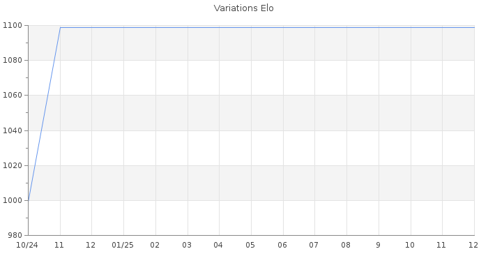 Date d'inscription : 26/10/24. Donateur pour EchecsEmail : Non ( Cliquez ici pour soutenir EchecsEmail. ) Elo non arrondi:1078.8 ( 485 sur 458 joueurs ) Nombre de victoires :2 Nombre de nulles :0 Nombre de défaites :3 Temps de réponse moyen par coup : 1J 9H 18M 54S ( Moyenne sur 0 coups ). Rd ( Un petit rd indique un elo fiable ) : 181 Elo maximum atteint ( en étant classé ) :0 Elo maximum atteint cette année :0 Nombre coups joués : 55 Classement coupe : Inactif Points coupe : 0 Classement Coupe Magic Chess : Inactif Points Coupe Magic Chess : 0 Tournoi échelle : Nombre de tournois gagnés :0
