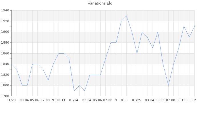 Date d'inscription : 19/11/20. Donateur pour EchecsEmail : Non ( Cliquez ici pour soutenir EchecsEmail. ) Elo non arrondi:1905.9 ( 174 sur 452 joueurs ) Nombre de victoires :246 Nombre de nulles :33 Nombre de défaites :213 Temps de réponse moyen par coup : 0J 9H 48M 17S ( Moyenne sur 502 coups ). Rd ( Un petit rd indique un elo fiable ) : 71 Magic Elo:1700 Magic Rd : 350 Elo maximum atteint ( en étant classé ) :1960 Elo maximum atteint cette année :1930 Nombre coups joués : 18320 Classement coupe : Inactif Points coupe : 0 Classement Coupe Magic Chess : Inactif Points Coupe Magic Chess : 0 Tournoi échelle : Inactif. Tournois gagnés : 16/04/2021 : Cat 3 : Victoire dans le tournoi n°22470 Nombre de tournois gagnés :1