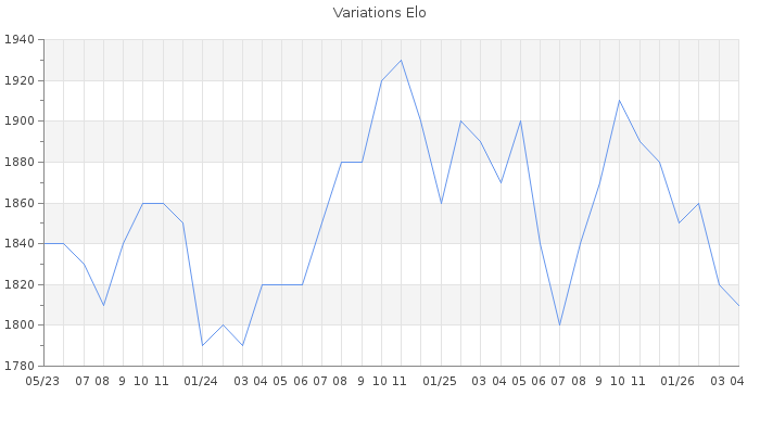 Date d'inscription : 19/11/20. Donateur pour EchecsEmail : Non ( Cliquez ici pour soutenir EchecsEmail. ) Elo non arrondi:1814.8 ( 228 sur 450 joueurs ) Nombre de victoires :256 Nombre de nulles :33 Nombre de défaites :231 Temps de réponse moyen par coup : 0J 15H 5M 10S ( Moyenne sur 522 coups ). Rd ( Un petit rd indique un elo fiable ) : 68 Magic Elo:1700 Magic Rd : 350 Elo maximum atteint ( en étant classé ) :1960 Elo maximum atteint cette année :1910 Nombre coups joués : 19363 Inscrit dans l' équipe:La Diagonale du Fou Classement coupe : Inactif Points coupe : 0 Classement Coupe Magic Chess : Inactif Points Coupe Magic Chess : 0 Tournoi échelle : Inactif. Tournois gagnés : 16/04/2021 : Cat 3 : Victoire dans le tournoi n°22470 Nombre de tournois gagnés :1