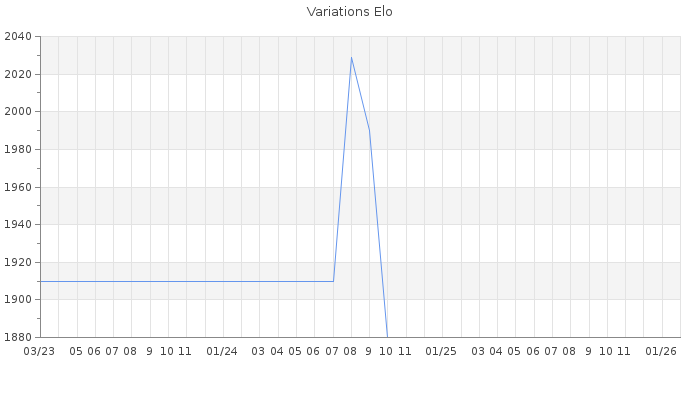 Date d'inscription : 07/03/21. Donateur pour EchecsEmail : Non ( Cliquez ici pour soutenir EchecsEmail. ) Elo non arrondi:1851.5 ( 195 sur 459 joueurs ) Nombre de victoires :29 Nombre de nulles :6 Nombre de défaites :22 Temps de réponse moyen par coup : 0J 7H 8M 54S ( Moyenne sur 0 coups ). Rd ( Un petit rd indique un elo fiable ) : 90 Elo maximum atteint ( en étant classé ) :2090 Elo maximum atteint cette année :0 Nombre coups joués : 1887 Classement coupe : Inactif Points coupe : 0 Classement Coupe Magic Chess : Inactif Points Coupe Magic Chess : 0 Tournoi échelle : Tournois gagnés : 18/01/2022 : Cat 4 : Victoire dans le tournoi n°23536 09/05/2021 : Cat 4 : Victoire dans le tournoi n°22686 Nombre de tournois gagnés :2
