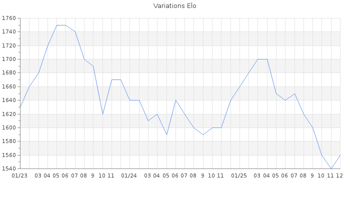 Date d'inscription : 26/12/11. Donateur pour EchecsEmail : Non ( Cliquez ici pour soutenir EchecsEmail. ) Elo non arrondi:1558.6 ( 349 sur 454 joueurs ) Nombre de victoires :433 Nombre de nulles :25 Nombre de défaites :524 Temps de réponse moyen par coup : 0J 17H 59M 0S ( Moyenne sur 421 coups ). Rd ( Un petit rd indique un elo fiable ) : 73 Magic Elo:1600 Magic Rd : 350 Elo maximum atteint ( en étant classé ) :1810 Elo maximum atteint cette année :1720 Nombre coups joués : 34714 Classement coupe : Inactif Points coupe : 0 Classement Coupe Magic Chess : Inactif Points Coupe Magic Chess : 0 Tournoi échelle : Inactif. Tournois gagnés : 24/03/2025 : Cat 3 : Victoire dans le tournoi n°26538 07/03/2023 : Cat 2 : Victoire dans le tournoi n°24546 05/01/2023 : Cat 2 : Victoire dans le tournoi n°24500 24/01/2021 : Cat 2 : Victoire dans le tournoi n°22155 16/10/2020 : Cat 2 : Victoire dans le tournoi n°21731 11/08/2020 : Cat 2 : Victoire dans le tournoi n°21524 07/07/2020 : Cat 2 : Victoire dans le tournoi n°21437 23/06/2020 : Cat 2 : Victoire dans le tournoi n°21251 09/12/2018 : Cat 3 : Victoire dans le tournoi n°18992 Nombre de tournois gagnés :9