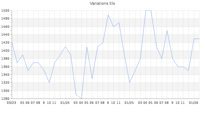 Date d'inscription : Avant le 20/12/05. Donateur pour EchecsEmail : Non ( Cliquez ici pour soutenir EchecsEmail. ) Elo non arrondi:1427.7 ( 390 sur 448 joueurs ) Nombre de victoires :9901 Nombre de nulles :446 Nombre de défaites :16400 Temps de réponse moyen par coup : 0J 5H 10M 13S ( Moyenne sur 8837 coups ). Rd ( Un petit rd indique un elo fiable ) : 50 Magic Elo:1362.94 Magic Rd : 80 Elo maximum atteint ( en étant classé ) :1730 Elo maximum atteint cette année :1460 Nombre coups joués : 892160 Inscrit dans l' équipe:fouschess Classement coupe : 53 Points coupe : 469.76 Classement Coupe Magic Chess : Inactif Points Coupe Magic Chess : 0 Tournoi échelle : Inactif. Tournois gagnés : 06/02/2026 : Cat 1 : Victoire dans le tournoi n°27328 29/11/2025 : Cat 2 : Victoire dans le tournoi n°27025 10/11/2025 : Cat 1 : Victoire dans le tournoi n°27096 07/11/2025 : Cat 2 : Victoire dans le tournoi n°27177 01/10/2025 : Cat 1 : Victoire dans le tournoi n°26919 16/09/2025 : Cat 1 : Victoire dans le tournoi n°26996 22/07/2025 : Cat 1 : Victoire dans le tournoi n°26862 09/07/2025 : Cat 1 : Victoire dans le tournoi n°26713 27/06/2025 : Cat 1 : Victoire dans le tournoi n°26764 19/06/2025 : Cat 2 : Victoire dans le tournoi n°26784 07/06/2025 : Cat 1 : Victoire dans le tournoi n°26742 01/05/2025 : Cat 1 : Victoire dans le tournoi n°26675 28/04/2025 : Cat 1 : Victoire dans le tournoi n°26637 17/04/2025 : Cat 1 : Victoire dans le tournoi n°26638 26/03/2025 : Cat 1 : Victoire dans le tournoi n°26590 17/02/2025 : Cat 1 : Victoire dans le tournoi n°26444 30/12/2024 : Cat 2 : Victoire dans le tournoi n°26302 22/10/2024 : Cat 1 : Victoire dans le tournoi n°26090 16/09/2024 : Cat 1 : Victoire dans le tournoi n°26039 10/09/2024 : Cat 1 : Victoire dans le tournoi n°26030 23/08/2024 : Cat 1 : Victoire dans le tournoi n°25993 27/07/2024 : Cat 1 : Victoire dans le tournoi n°25912 12/07/2024 : Cat 1 : Victoire dans le tournoi n°25887 19/06/2024 : Cat 1 : Victoire dans le tournoi n°25838 11/05/2024 : Cat 1 : Victoire dans le tournoi n°25799 04/03/2024 : Cat 1 : Victoire dans le tournoi n°25500 28/02/2024 : Cat 1 : Victoire dans le tournoi n°25409 13/02/2024 : Cat 1 : Victoire dans le tournoi n°25578 06/02/2024 : Cat 1 : Victoire dans le tournoi n°25536 27/01/2024 : Cat 2 : Victoire dans le tournoi n°25513 14/01/2024 : Cat 2 : Victoire dans le tournoi n°25452 26/12/2023 : Cat 1 : Victoire dans le tournoi n°25446 22/12/2023 : Cat 0 : Victoire dans le tournoi n°25285 02/10/2023 : Cat 2 : Victoire dans le tournoi n°25236 05/08/2023 : Cat 1 : Victoire dans le tournoi n°25077 05/07/2023 : Cat 2 : Victoire dans le tournoi n°25031 15/06/2023 : Cat 1 : Victoire dans le tournoi n°24980 18/04/2023 : Cat 1 : Victoire dans le tournoi n°24761 16/04/2023 : Cat 1 : Victoire dans le tournoi n°24786 27/12/2022 : Cat 2 : Victoire dans le tournoi n°24407 02/12/2022 : Cat 1 : Victoire dans le tournoi n°24417 29/11/2022 : Cat 1 : Victoire dans le tournoi n°24291 11/11/2022 : Cat 1 : Victoire dans le tournoi n°24314 02/08/2022 : Cat 2 : Victoire dans le tournoi n°24111 18/07/2022 : Cat 1 : Victoire dans le tournoi n°23981 04/07/2022 : Cat 1 : Victoire dans le tournoi n°23793 15/06/2022 : Cat 1 : Victoire dans le tournoi n°23931 13/06/2022 : Cat 2 : Victoire dans le tournoi n°23948 02/06/2022 : Cat 2 : Victoire dans le tournoi n°23910 30/04/2022 : Cat 1 : Victoire dans le tournoi n°23819 31/01/2022 : Cat 1 : Victoire dans le tournoi n°23564 24/11/2021 : Cat 1 : Victoire dans le tournoi n°23366 18/10/2021 : Cat 2 : Victoire dans le tournoi n°23238 15/10/2021 : Cat 1 : Victoire dans le tournoi n°23208 14/10/2021 : Cat 2 : Victoire dans le tournoi n°23185 25/09/2021 : Cat 2 : Victoire dans le tournoi n°22933 20/09/2021 : Cat 1 : Victoire dans le tournoi n°23169 19/09/2021 : Cat 1 : Victoire dans le tournoi n°23121 16/09/2021 : Cat 1 : Victoire dans le tournoi n°23064 15/09/2021 : Cat 1 : Victoire dans le tournoi n°23129 17/08/2021 : Cat 1 : Victoire dans le tournoi n°22555 07/08/2021 : Cat 2 : Victoire dans le tournoi n°22864 01/08/2021 : Cat 1 : Victoire dans le tournoi n°22985 30/07/2021 : Cat 2 : Victoire dans le tournoi n°22770 28/07/2021 : Cat 2 : Victoire dans le tournoi n°22967 27/07/2021 : Cat 2 : Victoire dans le tournoi n°22843 24/07/2021 : Cat 2 : Victoire dans le tournoi n°22937 19/07/2021 : Cat 2 : Victoire dans le tournoi n°22892 03/07/2021 : Cat 2 : Victoire dans le tournoi n°22597 18/05/2021 : Cat 2 : Victoire dans le tournoi n°22773 04/05/2021 : Cat 2 : Victoire dans le tournoi n°22681 13/04/2021 : Cat 1 : Victoire dans le tournoi n°22546 29/03/2021 : Cat 2 : Victoire dans le tournoi n°22524 05/02/2021 : Cat 1 : Victoire dans le tournoi n°21834 16/12/2020 : Cat 2 : Victoire dans le tournoi n°22078 14/12/2020 : Cat 1 : Victoire dans le tournoi n°21898 11/12/2020 : Cat 1 : Victoire dans le tournoi n°22020 03/12/2020 : Cat 2 : Victoire dans le tournoi n°22039 26/11/2020 : Cat 1 : Victoire dans le tournoi n°21878 26/11/2020 : Cat 2 : Victoire dans le tournoi n°21849 06/10/2020 : Cat 1 : Victoire dans le tournoi n°21846 22/09/2020 : Cat 2 : Victoire dans le tournoi n°21701 12/09/2020 : Cat 1 : Victoire dans le tournoi n°21554 05/09/2020 : Cat 2 : Victoire dans le tournoi n°21700 29/08/2020 : Cat 1 : Victoire dans le tournoi n°21569 21/08/2020 : Cat 2 : Victoire dans le tournoi n°21535 15/08/2020 : Cat 2 : Victoire dans le tournoi n°21601 13/08/2020 : Cat 1 : Victoire dans le tournoi n°21606 22/07/2020 : Cat 1 : Victoire dans le tournoi n°21506 19/07/2020 : Cat 2 : Victoire dans le tournoi n°21487 01/07/2020 : Cat 2 : Victoire dans le tournoi n°21425 22/06/2020 : Cat 1 : Victoire dans le tournoi n°21330 21/06/2020 : Cat 2 : Victoire dans le tournoi n°21404 09/06/2020 : Cat 2 : Victoire dans le tournoi n°20555 09/05/2020 : Cat 1 : Victoire dans le tournoi n°20752 09/05/2020 : Cat 1 : Victoire dans le tournoi n°20865 23/04/2020 : Cat 2 