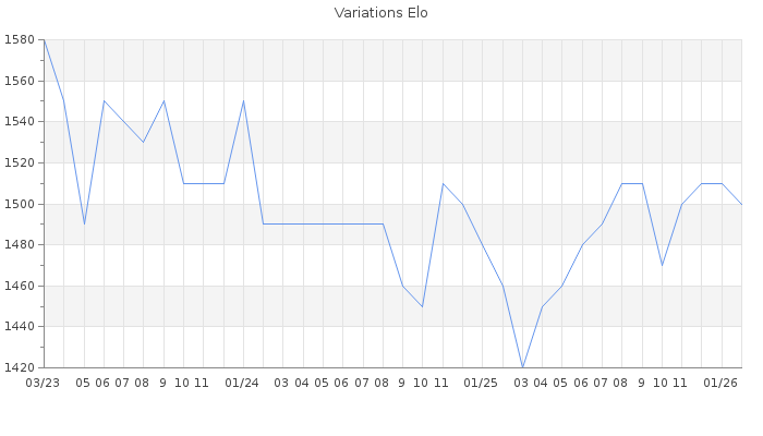 Date d'inscription : 12/07/07. Donateur pour EchecsEmail : Non ( Cliquez ici pour soutenir EchecsEmail. ) Elo non arrondi:1498.8 ( 375 sur 458 joueurs ) Nombre de victoires :1067 Nombre de nulles :70 Nombre de défaites :891 Temps de réponse moyen par coup : 0J 12H 38M 18S ( Moyenne sur 610 coups ). Rd ( Un petit rd indique un elo fiable ) : 71 Magic Elo:1600 Magic Rd : 350 Elo maximum atteint ( en étant classé ) :1790 Elo maximum atteint cette année :1520 Nombre coups joués : 68080 Classement coupe : Inactif Points coupe : 0.67 Classement Coupe Magic Chess : Inactif Points Coupe Magic Chess : 0 Tournoi échelle : Inactif. Tournois gagnés : 02/11/2025 : Cat 1 : Victoire dans le tournoi n°26856 07/09/2025 : Cat 1 : Victoire dans le tournoi n°26884 05/08/2025 : Cat 2 : Victoire dans le tournoi n°26811 27/01/2024 : Cat 2 : Victoire dans le tournoi n°25460 14/09/2023 : Cat 2 : Victoire dans le tournoi n°25172 15/09/2021 : Cat 2 : Victoire dans le tournoi n°22966 19/05/2021 : Cat 2 : Victoire dans le tournoi n°22715 17/05/2021 : Cat 2 : Victoire dans le tournoi n°22615 12/05/2021 : Cat 2 : Victoire dans le tournoi n°22638 05/03/2021 : Cat 2 : Victoire dans le tournoi n°22359 12/01/2021 : Cat 2 : Victoire dans le tournoi n°22181 17/10/2020 : Cat 2 : Victoire dans le tournoi n°21865 28/09/2020 : Cat 1 : Victoire dans le tournoi n°21739 28/09/2020 : Cat 1 : Victoire dans le tournoi n°21704 13/04/2020 : Cat 2 : Victoire dans le tournoi n°20951 20/03/2020 : Cat 2 : Victoire dans le tournoi n°20876 28/07/2019 : Cat 1 : Victoire dans le tournoi n°19703 24/07/2019 : Cat 1 : Victoire dans le tournoi n°19842 09/12/2018 : Cat 1 : Victoire dans le tournoi n°18930 08/06/2015 : Cat 1 : Victoire dans le tournoi n°17668 02/01/2015 : Cat 1 : Victoire dans le tournoi n°16640 Nombre de tournois gagnés :21