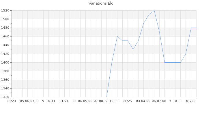 Date d'inscription : 09/01/17. Donateur pour EchecsEmail : Non ( Cliquez ici pour soutenir EchecsEmail. ) Elo non arrondi:1475.5 ( 386 sur 463 joueurs ) Nombre de victoires :61 Nombre de nulles :1 Nombre de défaites :89 Temps de réponse moyen par coup : 0J 19H 6M 0S ( Moyenne sur 177 coups ). Rd ( Un petit rd indique un elo fiable ) : 90 Elo maximum atteint ( en étant classé ) :1600 Elo maximum atteint cette année :1480 Nombre coups joués : 4473 Inscrit dans l' équipe:Fair play Classement coupe : Inactif Points coupe : 0 Classement Coupe Magic Chess : Inactif Points Coupe Magic Chess : 0 Tournoi échelle : Inactif. Nombre de tournois gagnés :0