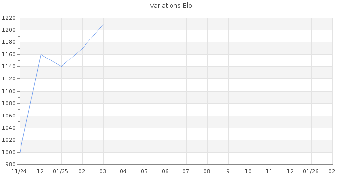 Date d'inscription : 18/11/24. Donateur pour EchecsEmail : Non ( Cliquez ici pour soutenir EchecsEmail. ) Elo non arrondi:1184.3 ( 474 sur 459 joueurs ) Nombre de victoires :16 Nombre de nulles :1 Nombre de défaites :39 Temps de réponse moyen par coup : 0J 3H 8M 15S ( Moyenne sur 4 coups ). Rd ( Un petit rd indique un elo fiable ) : 71 Elo maximum atteint ( en étant classé ) :1280 Elo maximum atteint cette année :0 Nombre coups joués : 1507 Classement coupe : Inactif Points coupe : 0 Classement Coupe Magic Chess : Inactif Points Coupe Magic Chess : 0 Tournoi échelle : Nombre de tournois gagnés :0