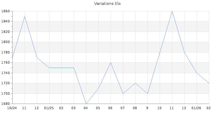 Date d'inscription : 02/10/24. Donateur pour EchecsEmail : Non ( Cliquez ici pour soutenir EchecsEmail. ) Elo non arrondi:1718.4 ( 269 sur 459 joueurs ) Nombre de victoires :331 Nombre de nulles :71 Nombre de défaites :276 Temps de réponse moyen par coup : 0J 12H 11M 9S ( Moyenne sur 2765 coups ). Rd ( Un petit rd indique un elo fiable ) : 55 Magic Elo:1700 Magic Rd : 350 Elo maximum atteint ( en étant classé ) :1930 Elo maximum atteint cette année :1800 Nombre coups joués : 26152 Inscrit dans l' équipe:O fou d hello Classement coupe : Inactif Points coupe : 0 Classement Coupe Magic Chess : Inactif Points Coupe Magic Chess : 0 Tournoi échelle : Tournois gagnés : 25/09/2025 : Cat 3 : Victoire dans le tournoi n°27014 16/07/2025 : Cat 3 : Victoire dans le tournoi n°26835 08/05/2025 : Cat 3 : Victoire dans le tournoi n°26504 19/12/2024 : Cat 2 : Victoire dans le tournoi n°26113 05/12/2024 : Cat 3 : Victoire dans le tournoi n°26265 03/12/2024 : Cat 3 : Victoire dans le tournoi n°26184 26/10/2024 : Cat 1 : Victoire dans le tournoi n°26137 17/10/2024 : Cat 2 : Victoire dans le tournoi n°26136 Nombre de tournois gagnés :8