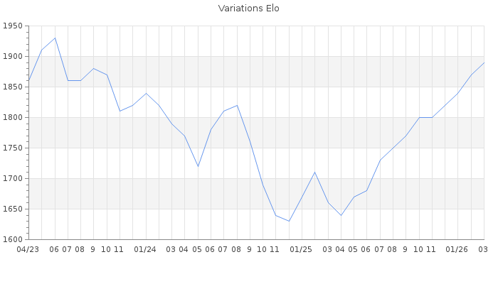 Date d'inscription : 22/12/15. Donateur pour EchecsEmail : Non ( Cliquez ici pour soutenir EchecsEmail. ) Elo non arrondi:1886.7 ( 177 sur 440 joueurs ) Nombre de victoires :534 Nombre de nulles :46 Nombre de défaites :308 Temps de réponse moyen par coup : 0J 16H 34M 42S ( Moyenne sur 408 coups ). Rd ( Un petit rd indique un elo fiable ) : 72 Magic Elo:1600 Magic Rd : 350 Elo maximum atteint ( en étant classé ) :2290 Elo maximum atteint cette année :1890 Nombre coups joués : 34892 Classement coupe : Inactif Points coupe : 0 Classement Coupe Magic Chess : Inactif Points Coupe Magic Chess : 0 Tournoi échelle : Inactif. Tournois gagnés : 11/06/2016 : Cat 5 : Victoire dans le tournoi n°14686 Nombre de tournois gagnés :1