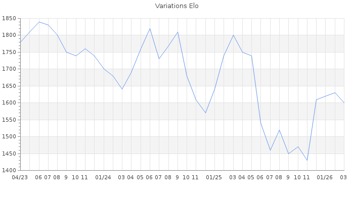 Date d'inscription : 29/12/21. Donateur pour EchecsEmail : Non ( Cliquez ici pour soutenir EchecsEmail. ) Elo non arrondi:1604.6 ( 319 sur 447 joueurs ) Nombre de victoires :493 Nombre de nulles :156 Nombre de défaites :480 Temps de réponse moyen par coup : 1J 0H 6M 59S ( Moyenne sur 1391 coups ). Rd ( Un petit rd indique un elo fiable ) : 58 Magic Elo:1700 Magic Rd : 350 Elo maximum atteint ( en étant classé ) :1870 Elo maximum atteint cette année :1660 Nombre coups joués : 32350 Inscrit dans l' équipe:Vikings Classement coupe : 66 Points coupe : 272.96 Classement Coupe Magic Chess : Inactif Points Coupe Magic Chess : 0 Tournoi échelle : Inactif. Tournois gagnés : 19/01/2026 : Cat 1 : Victoire dans le tournoi n°27295 28/12/2025 : Cat 1 : Victoire dans le tournoi n°27296 17/12/2025 : Cat 2 : Victoire dans le tournoi n°27124 16/12/2025 : Cat 1 : Victoire dans le tournoi n°27193 06/05/2025 : Cat 3 : Victoire dans le tournoi n°26580 28/03/2025 : Cat 2 : Victoire dans le tournoi n°26519 21/02/2025 : Cat 2 : Victoire dans le tournoi n°26324 11/06/2024 : Cat 3 : Victoire dans le tournoi n°25857 24/05/2024 : Cat 2 : Victoire dans le tournoi n°25795 18/05/2024 : Cat 2 : Victoire dans le tournoi n°25736 17/02/2022 : Cat 2 : Victoire dans le tournoi n°23521 Nombre de tournois gagnés :11