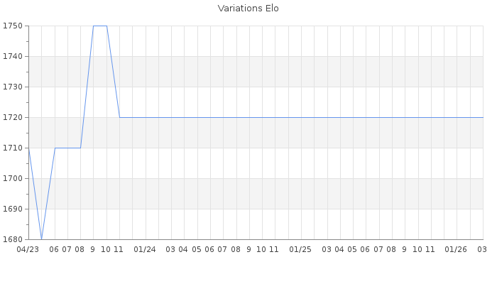 Date d'inscription : 12/12/10. Donateur pour EchecsEmail : Non ( Cliquez ici pour soutenir EchecsEmail. ) Elo non arrondi:1684.7 ( 311 sur 439 joueurs ) Nombre de victoires :116 Nombre de nulles :36 Nombre de défaites :75 Temps de réponse moyen par coup : 0J 16H 6M 46S ( Moyenne sur 0 coups ). Rd ( Un petit rd indique un elo fiable ) : 102 Elo maximum atteint ( en étant classé ) :2030 Elo maximum atteint cette année :0 Nombre coups joués : 5677 Classement coupe : Inactif Points coupe : 0 Classement Coupe Magic Chess : Inactif Points Coupe Magic Chess : 0 Tournoi échelle : Tournois gagnés : 01/04/2023 : Cat 2 : Victoire dans le tournoi n°24697 21/02/2023 : Cat 2 : Victoire dans le tournoi n°24611 19/01/2023 : Cat 1 : Victoire dans le tournoi n°24476 18/01/2020 : Cat 3 : Victoire dans le tournoi n°20297 05/01/2020 : Cat 3 : Victoire dans le tournoi n°20520 08/10/2019 : Cat 2 : Victoire dans le tournoi n°20156 11/09/2019 : Cat 2 : Victoire dans le tournoi n°19849 20/04/2018 : Cat 2 : Victoire dans le tournoi n°17925 19/03/2018 : Cat 1 : Victoire dans le tournoi n°17803 05/03/2018 : Cat 1 : Victoire dans le tournoi n°17639 28/01/2018 : Cat 1 : Victoire dans le tournoi n°17437 05/01/2014 : Cat 3 : Victoire dans le tournoi n°14161 31/05/2013 : Cat 4 : Victoire dans le tournoi n°12307 05/04/2013 : Cat 3 : Victoire dans le tournoi n°11778 09/01/2013 : Cat 3 : Victoire dans le tournoi n°11236 18/07/2011 : Cat 3 : Victoire dans le tournoi n°8685 13/01/2011 : Cat 0 : Victoire dans le tournoi n°8118 Nombre de tournois gagnés :17