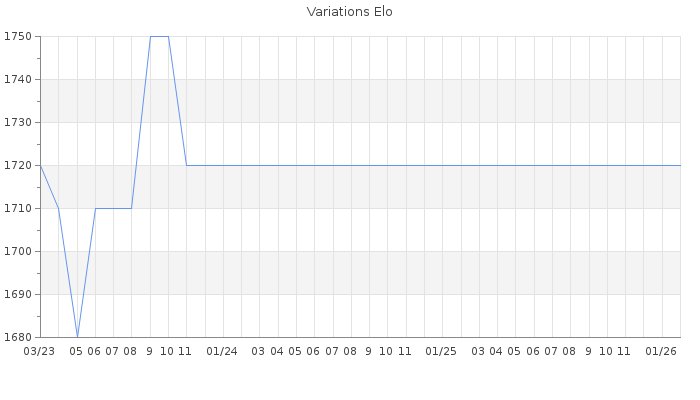 Date d'inscription : 12/12/10. Donateur pour EchecsEmail : Non ( Cliquez ici pour soutenir EchecsEmail. ) Elo non arrondi:1688.7 ( 311 sur 459 joueurs ) Nombre de victoires :116 Nombre de nulles :36 Nombre de défaites :75 Temps de réponse moyen par coup : 0J 16H 6M 46S ( Moyenne sur 0 coups ). Rd ( Un petit rd indique un elo fiable ) : 102 Elo maximum atteint ( en étant classé ) :2030 Elo maximum atteint cette année :0 Nombre coups joués : 5677 Classement coupe : Inactif Points coupe : 0 Classement Coupe Magic Chess : Inactif Points Coupe Magic Chess : 0 Tournoi échelle : Tournois gagnés : 01/04/2023 : Cat 2 : Victoire dans le tournoi n°24697 21/02/2023 : Cat 2 : Victoire dans le tournoi n°24611 19/01/2023 : Cat 1 : Victoire dans le tournoi n°24476 18/01/2020 : Cat 3 : Victoire dans le tournoi n°20297 05/01/2020 : Cat 3 : Victoire dans le tournoi n°20520 08/10/2019 : Cat 2 : Victoire dans le tournoi n°20156 11/09/2019 : Cat 2 : Victoire dans le tournoi n°19849 20/04/2018 : Cat 2 : Victoire dans le tournoi n°17925 19/03/2018 : Cat 1 : Victoire dans le tournoi n°17803 05/03/2018 : Cat 1 : Victoire dans le tournoi n°17639 28/01/2018 : Cat 1 : Victoire dans le tournoi n°17437 05/01/2014 : Cat 3 : Victoire dans le tournoi n°14161 31/05/2013 : Cat 4 : Victoire dans le tournoi n°12307 05/04/2013 : Cat 3 : Victoire dans le tournoi n°11778 09/01/2013 : Cat 3 : Victoire dans le tournoi n°11236 18/07/2011 : Cat 3 : Victoire dans le tournoi n°8685 13/01/2011 : Cat 0 : Victoire dans le tournoi n°8118 Nombre de tournois gagnés :17
