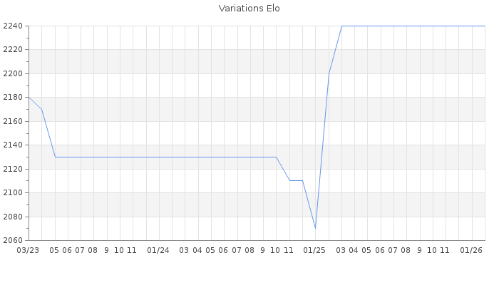 Date d'inscription : 29/10/08. Donateur pour EchecsEmail : Oui ( Cliquez ici pour soutenir EchecsEmail. ) Elo non arrondi:2211.7 ( 55 sur 463 joueurs ) Nombre de victoires :295 Nombre de nulles :146 Nombre de défaites :291 Temps de réponse moyen par coup : 0J 13H 31M 22S ( Moyenne sur 1 coups ). Rd ( Un petit rd indique un elo fiable ) : 115 Elo maximum atteint ( en étant classé ) :2290 Elo maximum atteint cette année :0 Nombre coups joués : 25743 Inscrit dans l' équipe:Les Rebelles Classement coupe : Inactif Points coupe : 0 Classement Coupe Magic Chess : Inactif Points Coupe Magic Chess : 0 Tournoi échelle : Tournois gagnés : 20/03/2025 : Cat 5 : Victoire dans le tournoi n°26397 26/01/2023 : Cat 5 : Victoire dans le tournoi n°24542 14/11/2022 : Cat 5 : Victoire dans le tournoi n°24375 19/06/2022 : Cat 5 : Victoire dans le tournoi n°23892 27/04/2022 : Cat 5 : Victoire dans le tournoi n°23738 06/11/2021 : Cat 5 : Victoire dans le tournoi n°23115 06/07/2021 : Cat 5 : Victoire dans le tournoi n°22848 05/06/2021 : Cat 5 : Victoire dans le tournoi n°22764 28/04/2021 : Cat 5 : Victoire dans le tournoi n°22581 11/04/2021 : Cat 5 : Victoire dans le tournoi n°22508 Nombre de tournois gagnés :10