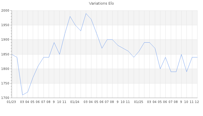 Date d'inscription : 23/02/08. Donateur pour EchecsEmail : Non ( Cliquez ici pour soutenir EchecsEmail. ) Elo non arrondi:1844.6 ( 213 sur 458 joueurs ) Nombre de victoires :1266 Nombre de nulles :106 Nombre de défaites :856 Temps de réponse moyen par coup : 0J 21H 15M 37S ( Moyenne sur 956 coups ). Rd ( Un petit rd indique un elo fiable ) : 58 Magic Elo:1600 Magic Rd : 350 Elo maximum atteint ( en étant classé ) :2080 Elo maximum atteint cette année :1900 Nombre coups joués : 72366 Classement coupe : Inactif Points coupe : 0 Classement Coupe Magic Chess : Inactif Points Coupe Magic Chess : 0 Tournoi échelle : Inactif. Tournois gagnés : 10/01/2019 : Cat 4 : Victoire dans le tournoi n°18879 17/04/2011 : Cat 3 : Victoire dans le tournoi n°8565 Nombre de tournois gagnés :2