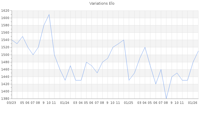 Date d'inscription : 06/09/16. Donateur pour EchecsEmail : Non ( Cliquez ici pour soutenir EchecsEmail. ) Elo non arrondi:1505.3 ( 370 sur 459 joueurs ) Nombre de victoires :3782 Nombre de nulles :261 Nombre de défaites :4216 Temps de réponse moyen par coup : 0J 5H 12M 24S ( Moyenne sur 7203 coups ). Rd ( Un petit rd indique un elo fiable ) : 50 Magic Elo:1700 Magic Rd : 350 Elo maximum atteint ( en étant classé ) :1680 Elo maximum atteint cette année :1520 Nombre coups joués : 272231 Classement coupe : 54 Points coupe : 457.09 Classement Coupe Magic Chess : Inactif Points Coupe Magic Chess : 0 Tournoi échelle : Inactif. Tournois gagnés : 17/10/2025 : Cat 1 : Victoire dans le tournoi n°27062 19/09/2025 : Cat 1 : Victoire dans le tournoi n°27033 09/09/2025 : Cat 1 : Victoire dans le tournoi n°26999 28/06/2025 : Cat 1 : Victoire dans le tournoi n°26721 28/04/2025 : Cat 1 : Victoire dans le tournoi n°26650 28/03/2025 : Cat 1 : Victoire dans le tournoi n°26599 01/03/2025 : Cat 1 : Victoire dans le tournoi n°26469 20/10/2024 : Cat 1 : Victoire dans le tournoi n°26119 17/09/2024 : Cat 1 : Victoire dans le tournoi n°26002 02/08/2024 : Cat 1 : Victoire dans le tournoi n°25906 21/06/2024 : Cat 1 : Victoire dans le tournoi n°25854 11/06/2024 : Cat 1 : Victoire dans le tournoi n°25806 06/05/2024 : Cat 1 : Victoire dans le tournoi n°25724 27/03/2024 : Cat 1 : Victoire dans le tournoi n°25642 05/03/2024 : Cat 2 : Victoire dans le tournoi n°25581 02/03/2024 : Cat 1 : Victoire dans le tournoi n°25621 08/01/2024 : Cat 1 : Victoire dans le tournoi n°25483 08/12/2023 : Cat 2 : Victoire dans le tournoi n°25303 23/10/2023 : Cat 2 : Victoire dans le tournoi n°25291 08/10/2023 : Cat 2 : Victoire dans le tournoi n°25209 28/09/2023 : Cat 2 : Victoire dans le tournoi n°25124 25/09/2023 : Cat 1 : Victoire dans le tournoi n°25143 15/06/2023 : Cat 2 : Victoire dans le tournoi n°24833 19/03/2023 : Cat 1 : Victoire dans le tournoi n°24605 10/02/2023 : Cat 2 : Victoire dans le tournoi n°24621 23/10/2022 : Cat 2 : Victoire dans le tournoi n°24318 09/10/2022 : Cat 2 : Victoire dans le tournoi n°24307 27/07/2022 : Cat 2 : Victoire dans le tournoi n°24084 02/07/2022 : Cat 2 : Victoire dans le tournoi n°23982 07/06/2022 : Cat 2 : Victoire dans le tournoi n°23955 15/04/2022 : Cat 2 : Victoire dans le tournoi n°23782 01/03/2022 : Cat 1 : Victoire dans le tournoi n°23530 20/02/2022 : Cat 1 : Victoire dans le tournoi n°23575 10/02/2022 : Cat 2 : Victoire dans le tournoi n°23493 24/12/2021 : Cat 2 : Victoire dans le tournoi n°23341 13/12/2021 : Cat 1 : Victoire dans le tournoi n°23284 23/11/2021 : Cat 2 : Victoire dans le tournoi n°23254 06/11/2021 : Cat 1 : Victoire dans le tournoi n°23295 13/10/2021 : Cat 1 : Victoire dans le tournoi n°23217 25/09/2021 : Cat 1 : Victoire dans le tournoi n°23140 03/09/2021 : Cat 1 : Victoire dans le tournoi n°23073 27/08/2021 : Cat 1 : Victoire dans le tournoi n°22999 27/08/2021 : Cat 2 : Victoire dans le tournoi n°23025 20/08/2021 : Cat 2 : Victoire dans le tournoi n°23046 06/08/2021 : Cat 1 : Victoire dans le tournoi n°23028 02/06/2021 : Cat 2 : Victoire dans le tournoi n°22757 01/04/2021 : Cat 2 : Victoire dans le tournoi n°22474 20/03/2021 : Cat 2 : Victoire dans le tournoi n°22445 20/01/2021 : Cat 2 : Victoire dans le tournoi n°22230 13/01/2021 : Cat 1 : Victoire dans le tournoi n°22165 07/01/2021 : Cat 2 : Victoire dans le tournoi n°21955 14/12/2020 : Cat 2 : Victoire dans le tournoi n°22045 11/12/2020 : Cat 1 : Victoire dans le tournoi n°22106 24/09/2020 : Cat 1 : Victoire dans le tournoi n°21679 19/09/2020 : Cat 1 : Victoire dans le tournoi n°21628 05/04/2020 : Cat 1 : Victoire dans le tournoi n°20832 28/03/2020 : Cat 2 : Victoire dans le tournoi n°20959 21/03/2020 : Cat 2 : Victoire dans le tournoi n°20478 09/03/2020 : Cat 2 : Victoire dans le tournoi n°20519 28/02/2020 : Cat 1 : Victoire dans le tournoi n°20739 24/02/2020 : Cat 1 : Victoire dans le tournoi n°20728 27/11/2019 : Cat 2 : Victoire dans le tournoi n°20187 11/11/2019 : Cat 1 : Victoire dans le tournoi n°20188 13/10/2019 : Cat 1 : Victoire dans le tournoi n°20057 12/10/2019 : Cat 1 : Victoire dans le tournoi n°20161 05/10/2019 : Cat 1 : Victoire dans le tournoi n°20027 22/09/2019 : Cat 1 : Victoire dans le tournoi n°20046 21/09/2019 : Cat 1 : Victoire dans le tournoi n°19928 16/09/2019 : Cat 1 : Victoire dans le tournoi n°20066 15/09/2019 : Cat 1 : Victoire dans le tournoi n°20098 14/09/2019 : Cat 1 : Victoire dans le tournoi n°19978 11/09/2019 : Cat 1 : Victoire dans le tournoi n°19814 03/09/2019 : Cat 1 : Victoire dans le tournoi n°19821 25/08/2019 : Cat 2 : Victoire dans le tournoi n°19909 22/08/2019 : Cat 2 : Victoire dans le tournoi n°19695 22/08/2019 : Cat 2 : Victoire dans le tournoi n°19913 08/08/2019 : Cat 1 : Victoire dans le tournoi n°19943 28/07/2019 : Cat 2 : Victoire dans le tournoi n°19688 18/07/2019 : Cat 2 : Victoire dans le tournoi n°19699 17/07/2019 : Cat 1 : Victoire dans le tournoi n°19879 05/07/2019 : Cat 2 : Victoire dans le tournoi n°19539 22/06/2019 : Cat 1 : Victoire dans le tournoi n°19758 19/05/2019 : Cat 2 : Victoire dans le tournoi n°19406 15/05/2019 : Cat 2 : Victoire dans le tournoi n°19619 10/05/2019 : Cat 2 : Victoire dans le tournoi n°19464 28/04/2019 : Cat 2 : Victoire dans le tournoi n°19604 07/04/2019 : Cat 2 : Victoire dans le tournoi n°19441 28/02/2019 : Cat 2 : Victoire dans le tournoi n°19136 22/02/2019 : Cat 2 : Victoire dans le tournoi n°19327 11/12/2018 : Cat 1 : Victoire dans le tournoi n°18947 06/12/2018 : Cat 2 : Victoire dans le tournoi n°18982 16/11/2018 : Cat 1 : Victoire dans le tournoi n°18910 13/10/2018 : Cat 1 : Victoire dans le tournoi n°18558 16/07/2018 : Cat 1 : Victoire dans le tournoi n°18148 21/05/2018 : Cat 1 : Victoire dans le tournoi n°18132 22/04/2018 : Cat 2 : Victoire dans le tournoi n°17923 20/01/2018 : Cat 2 : Victoire dans le tournoi n°17598 02/12/2017