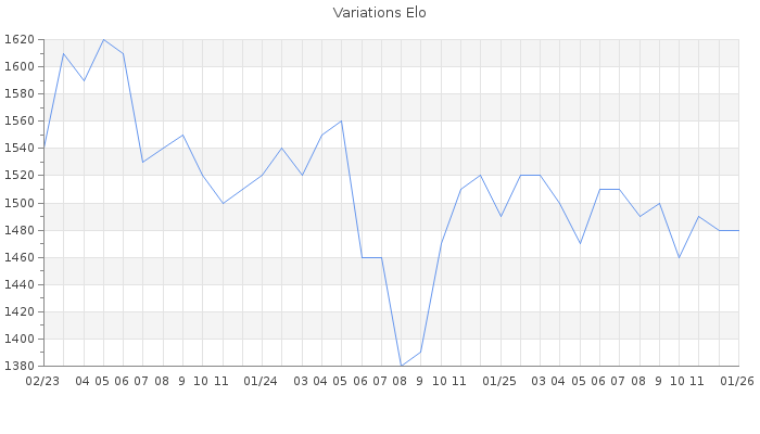 Date d'inscription : 01/02/09. Donateur pour EchecsEmail : Non ( Cliquez ici pour soutenir EchecsEmail. ) Elo non arrondi:1484.9 ( 379 sur 459 joueurs ) Nombre de victoires :728 Nombre de nulles :20 Nombre de défaites :813 Temps de réponse moyen par coup : 0J 22H 41M 52S ( Moyenne sur 460 coups ). Rd ( Un petit rd indique un elo fiable ) : 63 Magic Elo:1600 Magic Rd : 350 Elo maximum atteint ( en étant classé ) :1790 Elo maximum atteint cette année :1490 Nombre coups joués : 45152 Classement coupe : Inactif Points coupe : 0 Classement Coupe Magic Chess : Inactif Points Coupe Magic Chess : 0 Tournoi échelle : Inactif. Tournois gagnés : 24/12/2018 : Cat 1 : Victoire dans le tournoi n°19018 17/07/2015 : Cat 0 : Premier au tournoi multi Eté 2015 n°10 Nombre de tournois gagnés :2