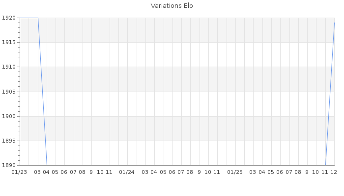 Date d'inscription : 12/05/10. Donateur pour EchecsEmail : Oui ( Cliquez ici pour soutenir EchecsEmail. ) Elo non arrondi:1923.1 ( 175 sur 459 joueurs ) Nombre de victoires :109 Nombre de nulles :19 Nombre de défaites :58 Temps de réponse moyen par coup : 0J 3H 23M 3S ( Moyenne sur 31 coups ). Rd ( Un petit rd indique un elo fiable ) : 186 Magic Elo:1600 Magic Rd : 350 Elo maximum atteint ( en étant classé ) :2070 Elo maximum atteint cette année :0 Nombre coups joués : 4657 Classement coupe : Inactif Points coupe : 0 Classement Coupe Magic Chess : Inactif Points Coupe Magic Chess : 0 Tournoi échelle : Inactif. Nombre de tournois gagnés :0