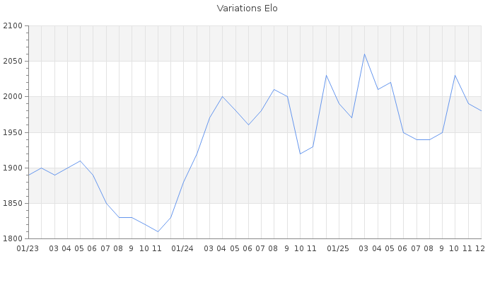 Date d'inscription : 04/12/18. Donateur pour EchecsEmail : Non ( Cliquez ici pour soutenir EchecsEmail. ) Elo non arrondi:1982.6 ( 131 sur 448 joueurs ) Nombre de victoires :328 Nombre de nulles :42 Nombre de défaites :328 Temps de réponse moyen par coup : 0J 5H 54M 55S ( Moyenne sur 577 coups ). Rd ( Un petit rd indique un elo fiable ) : 70 Elo maximum atteint ( en étant classé ) :2060 Elo maximum atteint cette année :2060 Nombre coups joués : 27096 Inscrit dans l' équipe:Royal Kids Classement coupe : Inactif Points coupe : 0 Classement Coupe Magic Chess : Inactif Points Coupe Magic Chess : 0 Tournoi échelle : Nombre de tournois gagnés :0
