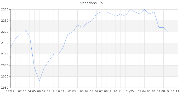 Date d'inscription : 29/09/22. Donateur pour EchecsEmail : Non ( Cliquez ici pour soutenir EchecsEmail. ) Elo non arrondi:2198.3 ( 64 sur 461 joueurs ) Nombre de victoires :213 Nombre de nulles :22 Nombre de défaites :109 Temps de réponse moyen par coup : 0J 8H 31M 47S ( Moyenne sur 364 coups ). Rd ( Un petit rd indique un elo fiable ) : 68 Elo maximum atteint ( en étant classé ) :2310 Elo maximum atteint cette année :2310 Nombre coups joués : 10859 Classement coupe : Inactif Points coupe : 0 Classement Coupe Magic Chess : Inactif Points Coupe Magic Chess : 0 Tournoi échelle : Nombre de tournois gagnés :0