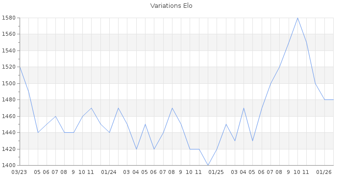 Date d'inscription : 08/04/16. Donateur pour EchecsEmail : Non ( Cliquez ici pour soutenir EchecsEmail. ) Elo non arrondi:1476.4 ( 384 sur 463 joueurs ) Nombre de victoires :304 Nombre de nulles :24 Nombre de défaites :366 Temps de réponse moyen par coup : 0J 9H 20M 3S ( Moyenne sur 104 coups ). Rd ( Un petit rd indique un elo fiable ) : 97 Magic Elo:1700 Magic Rd : 350 Elo maximum atteint ( en étant classé ) :1660 Elo maximum atteint cette année :1480 Nombre coups joués : 26250 Classement coupe : Inactif Points coupe : 0 Classement Coupe Magic Chess : Inactif Points Coupe Magic Chess : 0 Tournoi échelle : Inactif. Tournois gagnés : 29/03/2023 : Cat 2 : Victoire dans le tournoi n°24718 27/12/2022 : Cat 2 : Victoire dans le tournoi n°24367 17/11/2022 : Cat 2 : Victoire dans le tournoi n°24386 10/10/2022 : Cat 2 : Victoire dans le tournoi n°24315 26/01/2022 : Cat 2 : Victoire dans le tournoi n°23486 05/12/2021 : Cat 2 : Victoire dans le tournoi n°23266 05/09/2021 : Cat 2 : Victoire dans le tournoi n°23017 30/07/2021 : Cat 2 : Victoire dans le tournoi n°22980 06/07/2021 : Cat 2 : Victoire dans le tournoi n°22875 14/11/2020 : Cat 2 : Victoire dans le tournoi n°21993 30/07/2020 : Cat 2 : Victoire dans le tournoi n°21417 02/11/2018 : Cat 2 : Victoire dans le tournoi n°18824 06/03/2018 : Cat 2 : Victoire dans le tournoi n°17731 12/01/2018 : Cat 2 : Victoire dans le tournoi n°17273 11/06/2017 : Cat 1 : Victoire dans le tournoi n°16428 27/10/2016 : Cat 2 : Victoire dans le tournoi n°14953 06/10/2016 : Cat 1 : Victoire dans le tournoi n°15125 Nombre de tournois gagnés :17