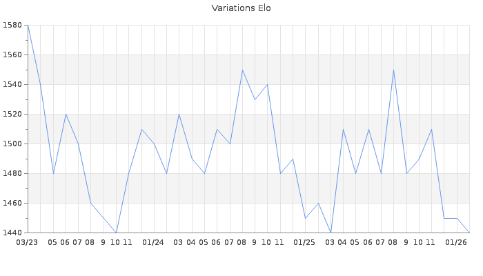 Date d'inscription : 05/10/18. Donateur pour EchecsEmail : Non ( Cliquez ici pour soutenir EchecsEmail. ) Elo non arrondi:1443.4 ( 389 sur 452 joueurs ) Nombre de victoires :1674 Nombre de nulles :301 Nombre de défaites :2141 Temps de réponse moyen par coup : 0J 4H 31M 24S ( Moyenne sur 5648 coups ). Rd ( Un petit rd indique un elo fiable ) : 53 Magic Elo:1441.4 Magic Rd : 80 Elo maximum atteint ( en étant classé ) :1670 Elo maximum atteint cette année :1450 Nombre coups joués : 200165 Inscrit dans l' équipe:au plaisir du jeux Classement coupe : 102 Points coupe : 71.36 Classement Coupe Magic Chess : 7 Points Coupe Magic Chess : 29.32 Tournoi échelle : Division 3 : 2 Tournois gagnés : 18/01/2026 : Cat 2 : Premier au tournoi multi Noël 2025 n°2 03/12/2025 : Cat 1 : Premier au tournoi multi Halloween 2025 n°3 05/11/2025 : Cat 2 : Victoire dans le tournoi n°27142 29/10/2025 : Cat 2 : Victoire dans le tournoi n°27112 27/10/2025 : Cat 2 : Victoire dans le tournoi n°26995 17/09/2025 : Cat 1 : Victoire dans le tournoi n°26952 11/09/2025 : Cat 2 : Victoire dans le tournoi n°26923 06/08/2025 : Cat 2 : Victoire dans le tournoi n°26941 03/08/2025 : Cat 1 : Victoire dans le tournoi n°26838 06/07/2025 : Cat 1 : Victoire dans le tournoi n°26691 15/06/2025 : Cat 1 : Victoire dans le tournoi n°26716 24/05/2025 : Cat 1 : Victoire dans le tournoi n°26693 07/04/2025 : Cat 1 : Victoire dans le tournoi n°26467 26/03/2025 : Cat 1 : Victoire dans le tournoi n°26554 14/03/2025 : Cat 1 : Victoire dans le tournoi n°26527 12/08/2024 : Cat 2 : Victoire dans le tournoi n°25986 04/05/2024 : Cat 2 : Victoire dans le tournoi n°25700 20/04/2024 : Cat 1 : Victoire dans le tournoi n°25663 28/02/2024 : Cat 1 : Victoire dans le tournoi n°25361 23/02/2024 : Cat 2 : Victoire dans le tournoi n°25534 22/02/2024 : Cat 2 : Premier au tournoi multi Noël 2023 n°2 05/02/2024 : Cat 2 : Victoire dans le tournoi n°25544 02/02/2024 : Cat 1 : Victoire dans le tournoi n°25504 10/01/2024 : Cat 2 : Victoire dans le tournoi n°25463 05/01/2024 : Cat 1 : Victoire dans le tournoi n°25430 31/12/2023 : Cat 2 : Premier au tournoi multi Halloween 2023 n°4 13/12/2023 : Cat 1 : Victoire dans le tournoi n°25410 11/12/2023 : Cat 1 : Victoire dans le tournoi n°25373 15/08/2023 : Cat 2 : Victoire dans le tournoi n°25065 09/08/2023 : Cat 1 : Victoire dans le tournoi n°25050 23/07/2023 : Cat 2 : Victoire dans le tournoi n°25033 19/07/2023 : Cat 1 : Victoire dans le tournoi n°25015 13/07/2023 : Cat 2 : Victoire dans le tournoi n°24958 11/07/2023 : Cat 2 : Victoire dans le tournoi n°25020 04/07/2023 : Cat 1 : Victoire dans le tournoi n°24938 22/06/2023 : Cat 1 : Victoire dans le tournoi n°24990 12/06/2023 : Cat 1 : Victoire dans le tournoi n°24935 16/04/2023 : Cat 2 : Victoire dans le tournoi n°24696 11/02/2023 : Cat 2 : Victoire dans le tournoi n°24579 03/01/2023 : Cat 2 : Victoire dans le tournoi n°24495 19/11/2022 : Cat 2 : Victoire dans le tournoi n°24302 12/11/2022 : Cat 1 : Victoire dans le tournoi n°24213 31/10/2022 : Cat 2 : Victoire dans le tournoi n°24322 14/10/2022 : Cat 2 : Victoire dans le tournoi n°24293 10/10/2022 : Cat 1 : Victoire dans le tournoi n°24178 23/09/2022 : Cat 2 : Victoire dans le tournoi n°24166 12/09/2022 : Cat 1 : Victoire dans le tournoi n°24180 11/09/2022 : Cat 2 : Victoire dans le tournoi n°24190 08/09/2022 : Cat 2 : Victoire dans le tournoi n°24170 04/09/2022 : Cat 2 : Victoire dans le tournoi n°24207 16/08/2022 : Cat 2 : Victoire dans le tournoi n°24139 18/07/2022 : Cat 2 : Premier au tournoi multi Eté 2022 n°3 15/07/2022 : Cat 2 : Victoire dans le tournoi n°24011 13/05/2022 : Cat 2 : Premier au tournoi multi Saint-Valentin 2022 n°1 01/05/2022 : Cat 2 : Victoire dans le tournoi n°23874 29/04/2022 : Cat 1 : Victoire dans le tournoi n°23846 22/04/2022 : Cat 1 : Victoire dans le tournoi n°23814 18/04/2022 : Cat 2 : Victoire dans le tournoi n°23755 27/03/2022 : Cat 1 : Premier au tournoi multi Saint-Valentin 2022 n°4 20/02/2022 : Cat 2 : Victoire dans le tournoi n°23640 06/01/2022 : Cat 3 : Premier au tournoi multi Halloween 2021 n°1 05/01/2022 : Cat 1 : Victoire dans le tournoi n°23469 24/11/2021 : Cat 2 : Premier au tournoi multi Halloween 2021 n°2 23/11/2021 : Cat 2 : Victoire dans le tournoi n°23305 18/11/2021 : Cat 2 : Victoire dans le tournoi n°23291 10/09/2021 : Cat 2 : Victoire dans le tournoi n°23022 11/08/2021 : Cat 2 : Premier au tournoi multi Eté 2021 n°4 10/08/2021 : Cat 2 : Victoire dans le tournoi n°22670 08/08/2021 : Cat 2 : Victoire dans le tournoi n°23024 14/06/2021 : Cat 1 : Victoire dans le tournoi n°22840 18/05/2021 : Cat 2 : Victoire dans le tournoi n°22572 08/05/2021 : Cat 2 : Victoire dans le tournoi n°22316 24/03/2021 : Cat 2 : Victoire dans le tournoi n°22469 17/03/2021 : Cat 1 : Victoire dans le tournoi n°22422 14/02/2021 : Cat 2 : Victoire dans le tournoi n°22371 15/01/2021 : Cat 2 : Victoire dans le tournoi n°22269 13/01/2021 : Cat 2 : Victoire dans le tournoi n°22193 12/01/2021 : Cat 2 : Victoire dans le tournoi n°22200 09/01/2021 : Cat 2 : Victoire dans le tournoi n°22236 23/12/2020 : Cat 2 : Victoire dans le tournoi n°22094 30/11/2020 : Cat 2 : Victoire dans le tournoi n°22057 29/11/2020 : Cat 2 : Victoire dans le tournoi n°21922 10/11/2020 : Cat 2 : Victoire dans le tournoi n°21991 31/10/2020 : Cat 2 : Victoire dans le tournoi n°21939 30/10/2020 : Cat 2 : Victoire CC Oct20 Asc 17/10/2020 : Cat 2 : Victoire dans le tournoi n°21856 28/09/2020 : Cat 2 : Victoire dans le tournoi n°21810 16/09/2020 : Cat 2 : Victoire dans le tournoi n°21698 14/09/2020 : Cat 2 : Victoire dans le tournoi n°21688 29/08/2020 : Cat 2 : Victoire dans le tournoi n°21678 28/08/2020 : Cat 2 : Victoire dans le tournoi n°21682 21/08/2020 : Cat 2 : Victoire dans le tournoi n°21591 08/08/2020 : Cat 2 : Victoire dans le tournoi n°21589 Nombre de tournois gagnés :103