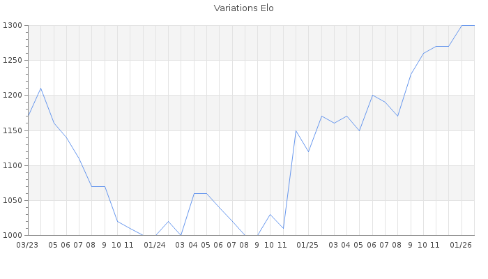Date d'inscription : 03/03/18. Donateur pour EchecsEmail : Non ( Cliquez ici pour soutenir EchecsEmail. ) Elo non arrondi:1299.8 ( 434 sur 463 joueurs ) Nombre de victoires :121 Nombre de nulles :11 Nombre de défaites :274 Temps de réponse moyen par coup : 1J 1H 38M 14S ( Moyenne sur 216 coups ). Rd ( Un petit rd indique un elo fiable ) : 80 Magic Elo:1600 Magic Rd : 350 Elo maximum atteint ( en étant classé ) :1300 Elo maximum atteint cette année :1300 Nombre coups joués : 12107 Inscrit dans l' équipe:Sol Seppy Classement coupe : Inactif Points coupe : 0 Classement Coupe Magic Chess : Inactif Points Coupe Magic Chess : 0 Tournoi échelle : Inactif. Nombre de tournois gagnés :0