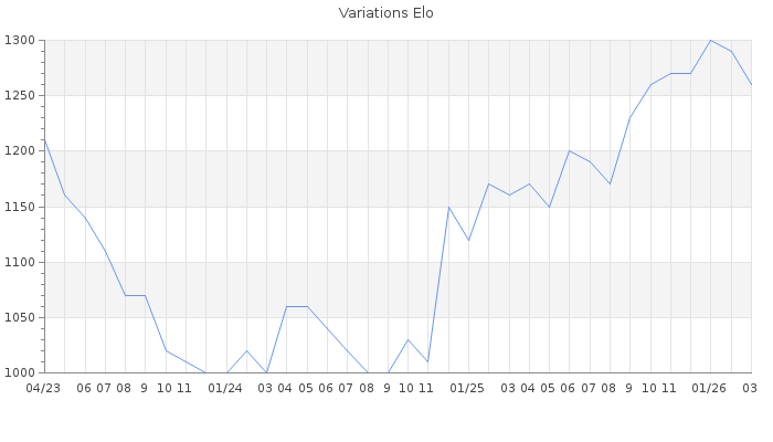 Date d'inscription : 03/03/18. Donateur pour EchecsEmail : Non ( Cliquez ici pour soutenir EchecsEmail. ) Elo non arrondi:1257.9 ( 418 sur 441 joueurs ) Nombre de victoires :123 Nombre de nulles :11 Nombre de défaites :279 Temps de réponse moyen par coup : 1J 1H 8M 12S ( Moyenne sur 228 coups ). Rd ( Un petit rd indique un elo fiable ) : 79 Magic Elo:1600 Magic Rd : 350 Elo maximum atteint ( en étant classé ) :1300 Elo maximum atteint cette année :1300 Nombre coups joués : 12274 Inscrit dans l' équipe:Sol Seppy Classement coupe : Inactif Points coupe : 0 Classement Coupe Magic Chess : Inactif Points Coupe Magic Chess : 0 Tournoi échelle : Inactif. Nombre de tournois gagnés :0