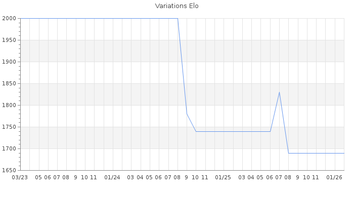 Date d'inscription : 13/07/19. Donateur pour EchecsEmail : Non ( Cliquez ici pour soutenir EchecsEmail. ) Elo non arrondi:1682.6 ( 286 sur 463 joueurs ) Nombre de victoires :55 Nombre de nulles :2 Nombre de défaites :47 Temps de réponse moyen par coup : 0J 6H 35M 3S ( Moyenne sur 10 coups ). Rd ( Un petit rd indique un elo fiable ) : 91 Magic Elo:1700 Magic Rd : 350 Elo maximum atteint ( en étant classé ) :2130 Elo maximum atteint cette année :0 Nombre coups joués : 2048 Classement coupe : 135 Points coupe : 13.66 Classement Coupe Magic Chess : Inactif Points Coupe Magic Chess : 0 Tournoi échelle : Inactif. Tournois gagnés : 01/10/2022 : Cat 4 : Victoire dans le tournoi n°24308 29/08/2020 : Cat 3 : Victoire dans le tournoi n°21221 19/08/2020 : Cat 5 : Victoire dans le tournoi n°21298 15/05/2020 : Cat 3 : Victoire dans le tournoi n°21229 20/12/2019 : Cat 3 : Victoire dans le tournoi n°20445 Nombre de tournois gagnés :5