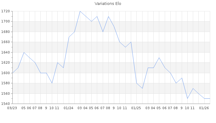 Date d'inscription : 23/03/09. Donateur pour EchecsEmail : Non ( Cliquez ici pour soutenir EchecsEmail. ) Elo non arrondi:1551.9 ( 350 sur 461 joueurs ) Nombre de victoires :905 Nombre de nulles :37 Nombre de défaites :912 Temps de réponse moyen par coup : 0J 15H 1M 50S ( Moyenne sur 326 coups ). Rd ( Un petit rd indique un elo fiable ) : 76 Magic Elo:1600 Magic Rd : 350 Elo maximum atteint ( en étant classé ) :1730 Elo maximum atteint cette année :1560 Nombre coups joués : 58711 Inscrit dans l' équipe:Vikings Classement coupe : Inactif, date de la dernière qualification : 04/05/24 Points coupe : 4.26 Classement Coupe Magic Chess : Inactif Points Coupe Magic Chess : 0 Tournoi échelle : Inactif. Tournois gagnés : 05/03/2024 : Cat 3 : Victoire dans le tournoi n°25523 22/01/2024 : Cat 2 : Victoire dans le tournoi n°25402 28/11/2023 : Cat 2 : Victoire dans le tournoi n°25324 22/09/2023 : Cat 2 : Victoire dans le tournoi n°24950 26/07/2023 : Cat 2 : Victoire dans le tournoi n°24981 21/01/2022 : Cat 2 : Victoire dans le tournoi n°23362 19/01/2022 : Cat 2 : Victoire dans le tournoi n°23277 30/07/2020 : Cat 2 : Victoire dans le tournoi n°21401 Nombre de tournois gagnés :8