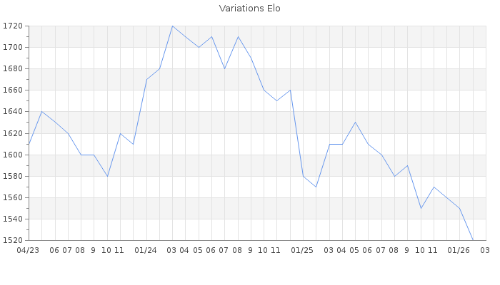 Date d'inscription : 23/03/09. Donateur pour EchecsEmail : Non ( Cliquez ici pour soutenir EchecsEmail. ) Elo non arrondi:1521.4 ( 350 sur 447 joueurs ) Nombre de victoires :905 Nombre de nulles :37 Nombre de défaites :914 Temps de réponse moyen par coup : 0J 16H 57M 58S ( Moyenne sur 344 coups ). Rd ( Un petit rd indique un elo fiable ) : 79 Magic Elo:1600 Magic Rd : 350 Elo maximum atteint ( en étant classé ) :1730 Elo maximum atteint cette année :1560 Nombre coups joués : 58861 Inscrit dans l' équipe:Vikings Classement coupe : 153 Points coupe : 4.05 Classement Coupe Magic Chess : Inactif Points Coupe Magic Chess : 0 Tournoi échelle : Inactif. Tournois gagnés : 05/03/2024 : Cat 3 : Victoire dans le tournoi n°25523 22/01/2024 : Cat 2 : Victoire dans le tournoi n°25402 28/11/2023 : Cat 2 : Victoire dans le tournoi n°25324 22/09/2023 : Cat 2 : Victoire dans le tournoi n°24950 26/07/2023 : Cat 2 : Victoire dans le tournoi n°24981 21/01/2022 : Cat 2 : Victoire dans le tournoi n°23362 19/01/2022 : Cat 2 : Victoire dans le tournoi n°23277 30/07/2020 : Cat 2 : Victoire dans le tournoi n°21401 Nombre de tournois gagnés :8