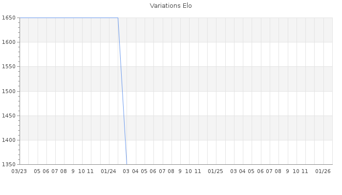 Date d'inscription : 21/10/14. Donateur pour EchecsEmail : Non ( Cliquez ici pour soutenir EchecsEmail. ) Elo non arrondi:1323.3 ( 473 sur 463 joueurs ) Nombre de victoires :854 Nombre de nulles :112 Nombre de défaites :933 Temps de réponse moyen par coup : 0J 13H 55M 44S ( Moyenne sur 0 coups ). Rd ( Un petit rd indique un elo fiable ) : 73 Magic Elo:1412.5 Magic Rd : 283 Elo maximum atteint ( en étant classé ) :1970 Elo maximum atteint cette année :0 Nombre coups joués : 58804 Classement coupe : Inactif, date de la dernière qualification : 09/03/24 Points coupe : 52.03 Classement Coupe Magic Chess : Inactif Points Coupe Magic Chess : 0 Tournoi échelle : Inactif. Tournois gagnés : 25/03/2022 : Cat 4 : Victoire dans le tournoi n°23697 08/12/2021 : Cat 4 : Victoire dans le tournoi n°23252 14/11/2021 : Cat 4 : Victoire dans le tournoi n°23261 13/11/2021 : Cat 4 : Victoire dans le tournoi n°23224 03/11/2021 : Cat 4 : Victoire dans le tournoi n°23237 15/10/2021 : Cat 3 : Victoire CC Sep21 Asc 05/10/2021 : Cat 4 : Victoire dans le tournoi n°23128 01/10/2021 : Cat 3 : Victoire dans le tournoi n°22640 04/09/2021 : Cat 3 : Victoire dans le tournoi n°22797 02/07/2021 : Cat 3 : Victoire dans le tournoi n°22789 18/05/2021 : Cat 3 : Victoire dans le tournoi n°22667 11/04/2021 : Cat 3 : Victoire dans le tournoi n°22531 12/12/2020 : Cat 2 : Victoire dans le tournoi n°22009 21/11/2020 : Cat 2 : Victoire dans le tournoi n°22019 02/08/2020 : Cat 3 : Victoire dans le tournoi n°21405 12/06/2020 : Cat 4 : Victoire dans le tournoi n°21090 26/02/2020 : Cat 3 : Victoire dans le tournoi n°20724 30/01/2020 : Cat 3 : Victoire dans le tournoi n°20418 27/01/2020 : Cat 3 : Victoire dans le tournoi n°20644 25/06/2018 : Cat 3 : Victoire dans le tournoi n°18127 18/06/2018 : Cat 3 : Victoire dans le tournoi n°18248 04/05/2018 : Cat 3 : Victoire dans le tournoi n°17962 11/03/2018 : Cat 2 : Victoire dans le tournoi n°17799 30/11/2017 : Cat 2 : Premier au tournoi multi Halloween 2017 n°5 08/11/2017 : Cat 2 : Victoire dans le tournoi n°17255 07/03/2017 : Cat 3 : Victoire dans le tournoi n°16134 18/02/2017 : Cat 2 : Victoire dans le tournoi n°15991 15/02/2017 : Cat 2 : Victoire dans le tournoi n°16068 28/01/2017 : Cat 2 : Victoire dans le tournoi n°16011 21/12/2015 : Cat 3 : Victoire dans le tournoi n°18680 01/11/2015 : Cat 3 : Victoire dans le tournoi n°18633 26/10/2015 : Cat 3 : Victoire dans le tournoi n°18543 22/10/2015 : Cat 2 : Victoire dans le tournoi n°18513 21/10/2015 : Cat 2 : Victoire dans le tournoi n°18449 20/10/2015 : Cat 2 : Victoire dans le tournoi n°18294 01/05/2015 : Cat 3 : Victoire dans le tournoi n°17287 06/02/2015 : Cat 3 : Victoire dans le tournoi n°16904 23/12/2014 : Cat 3 : Victoire dans le tournoi n°16639 28/11/2014 : Cat 2 : Victoire dans le tournoi n°16412 23/11/2014 : Cat 4 : Victoire dans le tournoi n°16536 18/11/2014 : Cat 0 : Premier au tournoi multi Halloween 2014 n°7 16/11/2014 : Cat 3 : Victoire dans le tournoi n°16436 04/11/2014 : Cat 2 : Victoire dans le tournoi n°16341 Nombre de tournois gagnés :43