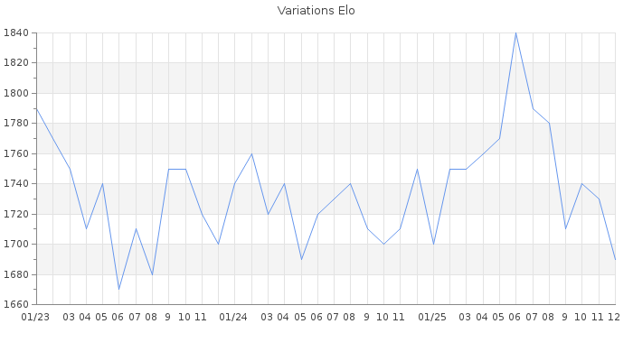 Date d'inscription : 03/04/16. Donateur pour EchecsEmail : Oui ( Cliquez ici pour soutenir EchecsEmail. ) Elo non arrondi:1686.8 ( 278 sur 449 joueurs ) Nombre de victoires :3865 Nombre de nulles :612 Nombre de défaites :3208 Temps de réponse moyen par coup : 0J 5H 53M 13S ( Moyenne sur 7098 coups ). Rd ( Un petit rd indique un elo fiable ) : 50 Magic Elo:1600 Magic Rd : 350 Elo maximum atteint ( en étant classé ) :1900 Elo maximum atteint cette année :1840 Nombre coups joués : 313112 Inscrit dans l' équipe:O fou d hello Classement coupe : 129 Points coupe : 24.04 Classement Coupe Magic Chess : Inactif Points Coupe Magic Chess : 0 Tournoi échelle : Inactif. Tournois gagnés : 21/11/2025 : Cat 2 : Victoire dans le tournoi n°27219 12/11/2025 : Cat 3 : Victoire dans le tournoi n°27151 15/10/2025 : Cat 3 : Victoire dans le tournoi n°27093 10/10/2025 : Cat 3 : Victoire dans le tournoi n°26964 28/07/2025 : Cat 3 : Victoire dans le tournoi n°26914 15/07/2025 : Cat 3 : Victoire dans le tournoi n°26887 13/07/2025 : Cat 3 : Victoire dans le tournoi n°26849 09/05/2025 : Cat 3 : Victoire dans le tournoi n°26695 01/05/2025 : Cat 3 : Victoire dans le tournoi n°26595 06/04/2025 : Cat 3 : Victoire dans le tournoi n°26640 13/03/2025 : Cat 2 : Victoire dans le tournoi n°26509 08/02/2025 : Cat 3 : Victoire dans le tournoi n°26336 15/01/2025 : Cat 2 : Victoire dans le tournoi n°26344 02/01/2025 : Cat 2 : Victoire dans le tournoi n°26274 06/12/2024 : Cat 2 : Victoire dans le tournoi n°26240 01/12/2024 : Cat 3 : Victoire dans le tournoi n°26243 31/10/2024 : Cat 3 : Victoire dans le tournoi n°26029 13/09/2024 : Cat 2 : Victoire dans le tournoi n°26035 20/07/2024 : Cat 3 : Victoire dans le tournoi n°25943 05/07/2024 : Cat 3 : Victoire dans le tournoi n°25719 26/05/2024 : Cat 2 : Victoire dans le tournoi n°25819 25/02/2024 : Cat 2 : Victoire dans le tournoi n°25512 22/01/2024 : Cat 2 : Victoire dans le tournoi n°25342 21/01/2024 : Cat 3 : Victoire dans le tournoi n°25462 27/12/2023 : Cat 2 : Victoire dans le tournoi n°25383 27/09/2023 : Cat 2 : Victoire dans le tournoi n°25185 31/07/2023 : Cat 2 : Victoire dans le tournoi n°25083 26/07/2023 : Cat 2 : Victoire dans le tournoi n°25012 14/06/2023 : Cat 3 : Victoire dans le tournoi n°24889 27/03/2023 : Cat 3 : Victoire dans le tournoi n°24655 14/10/2022 : Cat 2 : Victoire dans le tournoi n°24255 01/10/2022 : Cat 2 : Victoire dans le tournoi n°24235 30/09/2022 : Cat 3 : Victoire dans le tournoi n°24227 26/08/2022 : Cat 2 : Victoire dans le tournoi n°24066 08/04/2022 : Cat 2 : Victoire dans le tournoi n°23757 26/03/2022 : Cat 2 : Victoire dans le tournoi n°23688 26/03/2022 : Cat 3 : Victoire dans le tournoi n°23446 31/12/2021 : Cat 3 : Victoire dans le tournoi n°23381 29/11/2021 : Cat 3 : Victoire dans le tournoi n°23194 04/11/2021 : Cat 3 : Victoire dans le tournoi n°23239 11/10/2021 : Cat 2 : Victoire dans le tournoi n°23135 09/10/2021 : Cat 2 : Victoire dans le tournoi n°23130 04/10/2021 : Cat 3 : Victoire dans le tournoi n°23105 26/09/2021 : Cat 2 : Victoire dans le tournoi n°23099 03/09/2021 : Cat 3 : Victoire dans le tournoi n°23071 31/08/2021 : Cat 2 : Victoire dans le tournoi n°22912 26/08/2021 : Cat 2 : Victoire dans le tournoi n°23013 25/08/2021 : Cat 2 : Victoire dans le tournoi n°23072 21/08/2021 : Cat 2 : Victoire dans le tournoi n°23034 19/08/2021 : Cat 2 : Victoire dans le tournoi n°22987 13/08/2021 : Cat 2 : Victoire dans le tournoi n°22959 08/08/2021 : Cat 2 : Victoire dans le tournoi n°22800 06/07/2021 : Cat 2 : Victoire dans le tournoi n°22705 13/05/2021 : Cat 2 : Victoire dans le tournoi n°22632 16/04/2021 : Cat 2 : Victoire dans le tournoi n°22439 24/03/2021 : Cat 2 : Victoire dans le tournoi n°22286 24/03/2021 : Cat 2 : Victoire dans le tournoi n°22303 13/03/2021 : Cat 2 : Victoire dans le tournoi n°22382 07/03/2021 : Cat 2 : Victoire dans le tournoi n°22414 14/12/2020 : Cat 3 : Victoire dans le tournoi n°21981 02/12/2020 : Cat 2 : Victoire dans le tournoi n°21975 27/10/2020 : Cat 2 : Victoire dans le tournoi n°21874 16/10/2020 : Cat 2 : Victoire dans le tournoi n°21600 12/10/2020 : Cat 2 : Victoire dans le tournoi n°21845 12/10/2020 : Cat 2 : Victoire dans le tournoi n°21790 09/10/2020 : Cat 2 : Victoire dans le tournoi n°21751 24/09/2020 : Cat 2 : Victoire dans le tournoi n°21659 29/08/2020 : Cat 2 : Victoire dans le tournoi n°21585 21/08/2020 : Cat 2 : Victoire dans le tournoi n°21475 16/08/2020 : Cat 2 : Victoire dans le tournoi n°21550 14/08/2020 : Cat 2 : Victoire dans le tournoi n°21461 27/06/2020 : Cat 2 : Victoire dans le tournoi n°21263 10/06/2020 : Cat 2 : Victoire dans le tournoi n°21248 26/04/2020 : Cat 2 : Victoire dans le tournoi n°21049 14/04/2020 : Cat 2 : Victoire dans le tournoi n°20931 23/02/2020 : Cat 3 : Victoire dans le tournoi n°20617 02/02/2020 : Cat 2 : Victoire dans le tournoi n°20501 27/10/2019 : Cat 2 : Victoire dans le tournoi n°19917 21/10/2019 : Cat 3 : Victoire dans le tournoi n°20177 21/09/2019 : Cat 3 : Victoire dans le tournoi n°20045 17/09/2019 : Cat 3 : Victoire dans le tournoi n°19949 15/09/2019 : Cat 2 : Victoire dans le tournoi n°19774 15/09/2019 : Cat 2 : Victoire dans le tournoi n°19798 01/09/2019 : Cat 2 : Victoire dans le tournoi n°19652 15/08/2019 : Cat 2 : Victoire dans le tournoi n°19718 04/08/2019 : Cat 2 : Victoire dans le tournoi n°19650 02/08/2019 : Cat 3 : Victoire dans le tournoi n°19596 01/08/2019 : Cat 2 : Premier au tournoi multi Eté 2019 n°2 30/07/2019 : Cat 2 : Victoire dans le tournoi n°19700 25/06/2019 : Cat 2 : Victoire dans le tournoi n°19702 03/06/2019 : Cat 2 : Victoire dans le tournoi n°19580 24/05/2019 : Cat 2 : Victoire dans le tournoi n°19471 27/04/2019 : Cat 2 : Victoire dans le tournoi n°19594 08/04/2019 : Cat 2 : Victoire dans le tournoi n°19378 07/04/2019 : Cat 2 : Victoire dans le tournoi n°19322 29/03/2019 : Cat 3 : Victoire dans le tournoi n°19476 25/03/2019 : Cat 2 : 