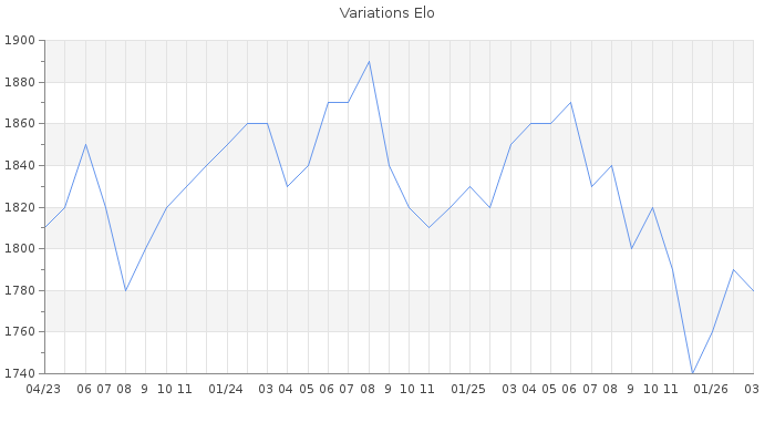 Date d'inscription : Avant le 20/12/05. Donateur pour EchecsEmail : Non ( Cliquez ici pour soutenir EchecsEmail. ) Elo non arrondi:1783.2 ( 234 sur 447 joueurs ) Nombre de victoires :857 Nombre de nulles :173 Nombre de défaites :926 Temps de réponse moyen par coup : 0J 4H 31M 58S ( Moyenne sur 840 coups ). Rd ( Un petit rd indique un elo fiable ) : 65 Magic Elo:1600 Magic Rd : 350 Elo maximum atteint ( en étant classé ) :1930 Elo maximum atteint cette année :1790 Nombre coups joués : 70955 Classement coupe : 75 Points coupe : 200.49 Classement Coupe Magic Chess : Inactif Points Coupe Magic Chess : 0 Tournoi échelle : Inactif. Tournois gagnés : 21/10/2025 : Cat 3 : Victoire dans le tournoi n°27122 11/10/2025 : Cat 3 : Victoire dans le tournoi n°27098 05/06/2025 : Cat 4 : Victoire dans le tournoi n°26781 30/05/2025 : Cat 3 : Victoire dans le tournoi n°26753 01/04/2025 : Cat 3 : Victoire dans le tournoi n°26632 17/03/2025 : Cat 3 : Victoire dans le tournoi n°26550 02/03/2024 : Cat 3 : Victoire dans le tournoi n°25591 24/01/2024 : Cat 3 : Victoire dans le tournoi n°25521 02/01/2024 : Cat 3 : Victoire dans le tournoi n°25470 17/12/2023 : Cat 3 : Victoire dans le tournoi n°25412 30/06/2023 : Cat 3 : Victoire dans le tournoi n°25027 25/02/2023 : Cat 3 : Victoire dans le tournoi n°24685 27/09/2022 : Cat 3 : Victoire dans le tournoi n°24248 28/08/2022 : Cat 3 : Victoire dans le tournoi n°24196 11/06/2022 : Cat 3 : Victoire dans le tournoi n°23984 03/06/2022 : Cat 3 : Victoire dans le tournoi n°23856 28/03/2022 : Cat 3 : Victoire dans le tournoi n°23771 29/01/2022 : Cat 3 : Victoire dans le tournoi n°23600 24/01/2022 : Cat 3 : Victoire dans le tournoi n°23496 01/11/2021 : Cat 3 : Victoire dans le tournoi n°23300 28/07/2021 : Cat 3 : Victoire dans le tournoi n°22984 21/07/2021 : Cat 3 : Victoire dans le tournoi n°22934 30/06/2021 : Cat 3 : Victoire dans le tournoi n°22885 05/04/2021 : Cat 3 : Victoire dans le tournoi n°22613 25/03/2021 : Cat 3 : Victoire dans le tournoi n°22567 14/02/2021 : Cat 3 : Victoire dans le tournoi n°22350 29/09/2020 : Cat 3 : Victoire dans le tournoi n°21803 11/07/2020 : Cat 3 : Victoire dans le tournoi n°21472 14/06/2020 : Cat 3 : Victoire dans le tournoi n°21371 26/03/2020 : Cat 3 : Victoire dans le tournoi n°20880 12/01/2020 : Cat 3 : Victoire dans le tournoi n°20622 16/12/2019 : Cat 3 : Victoire dans le tournoi n°20422 24/10/2019 : Cat 3 : Victoire dans le tournoi n°20294 26/08/2019 : Cat 3 : Victoire dans le tournoi n°20014 14/07/2019 : Cat 3 : Victoire dans le tournoi n°19766 17/04/2019 : Cat 3 : Victoire dans le tournoi n°19524 01/04/2019 : Cat 2 : Victoire dans le tournoi n°19440 20/09/2018 : Cat 3 : Victoire dans le tournoi n°18594 12/11/2017 : Cat 3 : Victoire dans le tournoi n°17288 26/10/2017 : Cat 3 : Victoire dans le tournoi n°17170 21/08/2017 : Cat 3 : Victoire dans le tournoi n°16667 09/08/2016 : Cat 3 : Victoire dans le tournoi n°15207 25/07/2016 : Cat 3 : Victoire dans le tournoi n°15088 31/03/2016 : Cat 2 : Victoire dans le tournoi n°14495 10/06/2015 : Cat 3 : Victoire dans le tournoi n°17727 22/05/2015 : Cat 3 : Victoire dans le tournoi n°17663 17/08/2014 : Cat 3 : Victoire dans le tournoi n°15659 20/01/2014 : Cat 3 : Victoire dans le tournoi n°14002 02/12/2013 : Cat 3 : Victoire dans le tournoi n°13741 21/04/2013 : Cat 3 : Victoire dans le tournoi n°12178 10/10/2012 : Cat 3 : Victoire dans le tournoi n°10891 05/04/2008 : Cat 2 : Victoire dans le tournoi n°4790 27/06/2007 : Cat 0 : Premier au tournoi multi Saint-Valentin n°1 18/05/2007 : Cat 0 : Premier au tournoi multi Printemps 2007 n°1 24/04/2007 : Cat 0 : Premier au tournoi multi Printemps 2007 n°4 20/04/2007 : Cat 0 : Premier au tournoi multi Saint-Valentin n°2 18/12/2006 : Cat 0 : Premier au tournoi multi Halloween 2006 n°5 10/12/2005 : Cat 1 : Victoire dans le tournoi n°2127 02/10/2005 : Cat 1 : Victoire dans le tournoi n°1752 27/05/2005 : Cat 1 : Victoire dans le tournoi n°1251 02/02/2005 : Cat 1 : Victoire dans le tournoi n°1093 14/12/2004 : Cat 1 : Victoire dans le tournoi n°954 Nombre de tournois gagnés :62