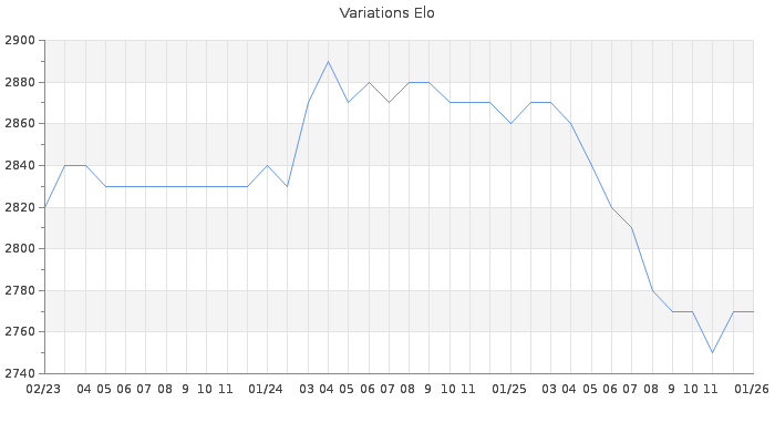 Date d'inscription : 06/07/06. Donateur pour EchecsEmail : Non ( Cliquez ici pour soutenir EchecsEmail. ) Elo non arrondi:2770.6 ( 10 sur 462 joueurs ) Nombre de victoires :449 Nombre de nulles :456 Nombre de défaites :35 Temps de réponse moyen par coup : 0J 7H 51M 16S ( Moyenne sur 732 coups ). Rd ( Un petit rd indique un elo fiable ) : 63 Magic Elo:1600 Magic Rd : 350 Elo maximum atteint ( en étant classé ) :2900 Elo maximum atteint cette année :2770 Nombre coups joués : 36249 Inscrit dans l' équipe:modesty Classement coupe : 4 Points coupe : 19178.2 Classement Coupe Magic Chess : Inactif Points Coupe Magic Chess : 0 Tournoi échelle : Inactif. Tournois gagnés : 29/06/2025 : Cat 7 : Victoire dans le tournoi n°26710 11/01/2025 : Cat 7 : Victoire dans le tournoi n°26180 12/09/2024 : Cat 7 : Victoire dans le tournoi n°25774 27/08/2024 : Cat 9 : Victoire CC Hiver 2024 11/08/2024 : Cat 7 : Victoire CC Jan24 03/04/2024 : Cat 7 : Victoire dans le tournoi n°25348 10/04/2019 : Cat 7 : Victoire dans le tournoi n°18712 26/03/2019 : Cat 7 : Victoire CC Nov18 04/09/2015 : Cat 7 : Victoire dans le tournoi n°17152 20/09/2013 : Cat 6 : Victoire dans le tournoi n°12477 20/12/2012 : Cat 6 : Victoire dans le tournoi n°11074 04/10/2012 : Cat 6 : Victoire dans le tournoi n°10751 03/10/2012 : Cat 6 : Victoire dans le tournoi n°10584 15/03/2012 : Cat 6 : Victoire dans le tournoi n°9606 23/10/2011 : Cat 6 : Victoire dans le tournoi n°8817 05/05/2011 : Cat 6 : Victoire dans le tournoi n°8373 10/06/2007 : Cat 4 : Victoire dans le tournoi n°3773 04/04/2007 : Cat 3 : Victoire dans le tournoi n°3629 06/02/2007 : Cat 3 : Victoire dans le tournoi n°3564 26/01/2007 : Cat 3 : Victoire dans le tournoi n°3544 14/01/2007 : Cat 3 : Victoire dans le tournoi n°3529 26/12/2006 : Cat 1 : Victoire dans le tournoi n°3445 12/12/2006 : Cat 2 : Victoire dans le tournoi n°3505 03/12/2006 : Cat 2 : Victoire dans le tournoi n°3518 10/11/2006 : Cat 3 : Victoire dans le tournoi n°3514 Nombre de tournois gagnés :25