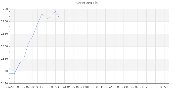 Date d'inscription : 13/10/19. Donateur pour EchecsEmail : Non ( Cliquez ici pour soutenir EchecsEmail. ) Elo non arrondi:1673.2 ( 319 sur 459 joueurs ) Nombre de victoires :178 Nombre de nulles :7 Nombre de défaites :164 Temps de réponse moyen par coup : 0J 16H 58M 58S ( Moyenne sur 0 coups ). Rd ( Un petit rd indique un elo fiable ) : 91 Magic Elo:1700 Magic Rd : 350 Elo maximum atteint ( en étant classé ) :1740 Elo maximum atteint cette année :0 Nombre coups joués : 13386 Classement coupe : Inactif Points coupe : 0 Classement Coupe Magic Chess : Inactif Points Coupe Magic Chess : 0 Tournoi échelle : Inactif. Nombre de tournois gagnés :0