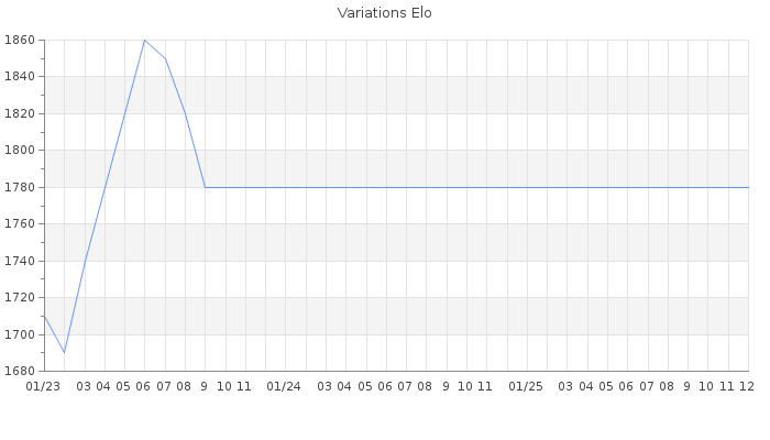 Date d'inscription : 24/09/13. Donateur pour EchecsEmail : Non ( Cliquez ici pour soutenir EchecsEmail. ) Elo non arrondi:1746.6 ( 278 sur 452 joueurs ) Nombre de victoires :223 Nombre de nulles :30 Nombre de défaites :173 Temps de réponse moyen par coup : 0J 8H 34M 22S ( Moyenne sur 0 coups ). Rd ( Un petit rd indique un elo fiable ) : 108 Elo maximum atteint ( en étant classé ) :2000 Elo maximum atteint cette année :0 Nombre coups joués : 18002 Classement coupe : Inactif Points coupe : 0 Classement Coupe Magic Chess : Inactif Points Coupe Magic Chess : 0 Tournoi échelle : Nombre de tournois gagnés :0