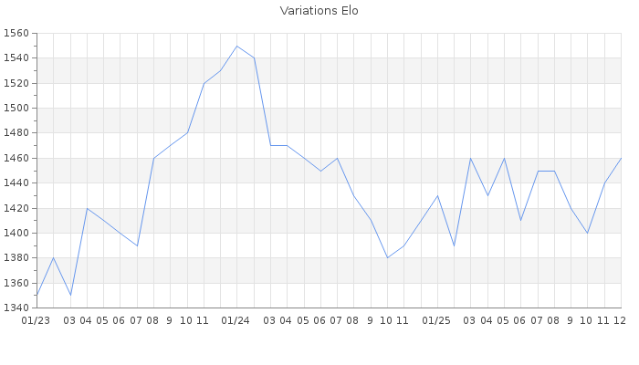 Date d'inscription : 30/06/06. Donateur pour EchecsEmail : Non ( Cliquez ici pour soutenir EchecsEmail. ) Elo non arrondi:1459.5 ( 380 sur 448 joueurs ) Nombre de victoires :589 Nombre de nulles :53 Nombre de défaites :828 Temps de réponse moyen par coup : 0J 17H 20M 43S ( Moyenne sur 247 coups ). Rd ( Un petit rd indique un elo fiable ) : 80 Magic Elo:1600 Magic Rd : 350 Elo maximum atteint ( en étant classé ) :1700 Elo maximum atteint cette année :1470 Nombre coups joués : 51628 Classement coupe : Inactif Points coupe : 0 Classement Coupe Magic Chess : Inactif Points Coupe Magic Chess : 0 Tournoi échelle : Tournois gagnés : 11/07/2025 : Cat 2 : Victoire dans le tournoi n°26613 20/12/2023 : Cat 2 : Victoire dans le tournoi n°25378 27/09/2023 : Cat 1 : Victoire dans le tournoi n°25178 05/06/2023 : Cat 1 : Victoire dans le tournoi n°24600 07/02/2023 : Cat 1 : Victoire dans le tournoi n°24555 31/03/2022 : Cat 2 : Victoire dans le tournoi n°23555 28/10/2020 : Cat 2 : Victoire dans le tournoi n°21797 01/07/2020 : Cat 2 : Victoire dans le tournoi n°21337 26/05/2020 : Cat 2 : Victoire dans le tournoi n°21124 04/01/2019 : Cat 2 : Victoire dans le tournoi n°18724 27/01/2018 : Cat 2 : Victoire dans le tournoi n°17474 26/08/2015 : Cat 2 : Victoire dans le tournoi n°17944 08/04/2015 : Cat 2 : Victoire dans le tournoi n°17370 01/07/2014 : Cat 2 : Victoire dans le tournoi n°15371 19/12/2012 : Cat 2 : Victoire dans le tournoi n°11290 06/08/2012 : Cat 2 : Victoire dans le tournoi n°10352 29/06/2012 : Cat 2 : Victoire dans le tournoi n°9991 05/03/2012 : Cat 2 : Victoire dans le tournoi n°9781 22/12/2011 : Cat 2 : Victoire dans le tournoi n°9327 14/12/2011 : Cat 2 : Victoire dans le tournoi n°9428 10/05/2011 : Cat 1 : Victoire dans le tournoi n°8379 03/04/2011 : Cat 1 : Victoire dans le tournoi n°8433 30/03/2011 : Cat 1 : Victoire dans le tournoi n°8505 13/03/2011 : Cat 0 : Victoire dans le tournoi n°8348 31/03/2009 : Cat 2 : Victoire dans le tournoi n°5690 02/01/2009 : Cat 2 : Victoire dans le tournoi n°5525 18/11/2008 : Cat 2 : Victoire dans le tournoi n°5377 23/05/2008 : Cat 1 : Victoire dans le tournoi n°4833 02/02/2008 : Cat 1 : Victoire dans le tournoi n°4441 08/07/2007 : Cat 0 : Victoire dans le tournoi n°4059 02/05/2007 : Cat 0 : Victoire dans le tournoi n°3986 27/10/2006 : Cat 0 : Victoire dans le tournoi n°3488 Nombre de tournois gagnés :32