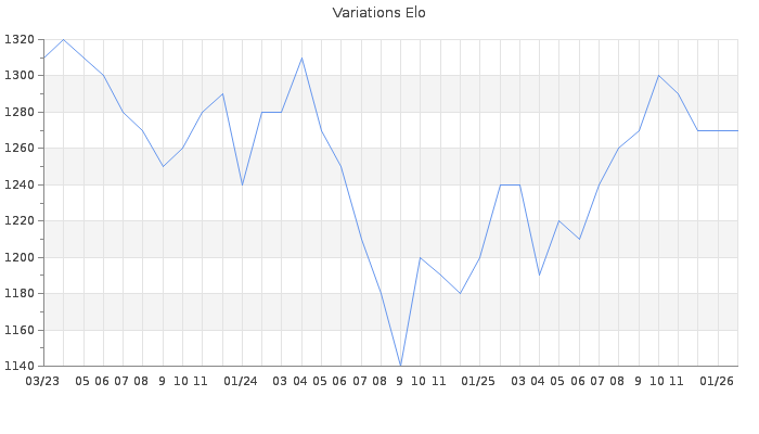 Date d'inscription : 16/04/07. Donateur pour EchecsEmail : Non ( Cliquez ici pour soutenir EchecsEmail. ) Elo non arrondi:1269.7 ( 438 sur 463 joueurs ) Nombre de victoires :1720 Nombre de nulles :114 Nombre de défaites :2166 Temps de réponse moyen par coup : 0J 13H 59M 48S ( Moyenne sur 992 coups ). Rd ( Un petit rd indique un elo fiable ) : 54 Magic Elo:1600 Magic Rd : 350 Elo maximum atteint ( en étant classé ) :1610 Elo maximum atteint cette année :1280 Nombre coups joués : 134961 Classement coupe : Inactif Points coupe : 0 Classement Coupe Magic Chess : Inactif Points Coupe Magic Chess : 0 Tournoi échelle : Nombre de tournois gagnés :0