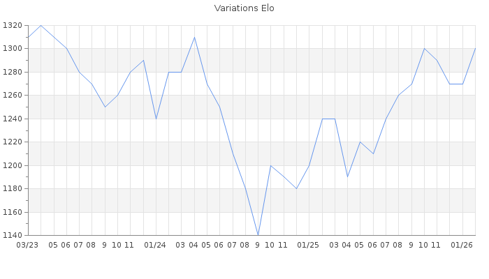 Date d'inscription : 16/04/07. Donateur pour EchecsEmail : Non ( Cliquez ici pour soutenir EchecsEmail. ) Elo non arrondi:1301.7 ( 431 sur 459 joueurs ) Nombre de victoires :1723 Nombre de nulles :114 Nombre de défaites :2166 Temps de réponse moyen par coup : 0J 13H 46M 31S ( Moyenne sur 1038 coups ). Rd ( Un petit rd indique un elo fiable ) : 60 Magic Elo:1600 Magic Rd : 350 Elo maximum atteint ( en étant classé ) :1610 Elo maximum atteint cette année :1300 Nombre coups joués : 135007 Classement coupe : Inactif Points coupe : 0 Classement Coupe Magic Chess : Inactif Points Coupe Magic Chess : 0 Tournoi échelle : Nombre de tournois gagnés :0