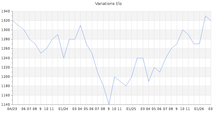 Date d'inscription : 16/04/07. Donateur pour EchecsEmail : Non ( Cliquez ici pour soutenir EchecsEmail. ) Elo non arrondi:1316.8 ( 407 sur 441 joueurs ) Nombre de victoires :1731 Nombre de nulles :115 Nombre de défaites :2174 Temps de réponse moyen par coup : 0J 15H 31M 3S ( Moyenne sur 958 coups ). Rd ( Un petit rd indique un elo fiable ) : 57 Magic Elo:1600 Magic Rd : 350 Elo maximum atteint ( en étant classé ) :1610 Elo maximum atteint cette année :1350 Nombre coups joués : 135634 Classement coupe : Inactif Points coupe : 0 Classement Coupe Magic Chess : Inactif Points Coupe Magic Chess : 0 Tournoi échelle : Nombre de tournois gagnés :0