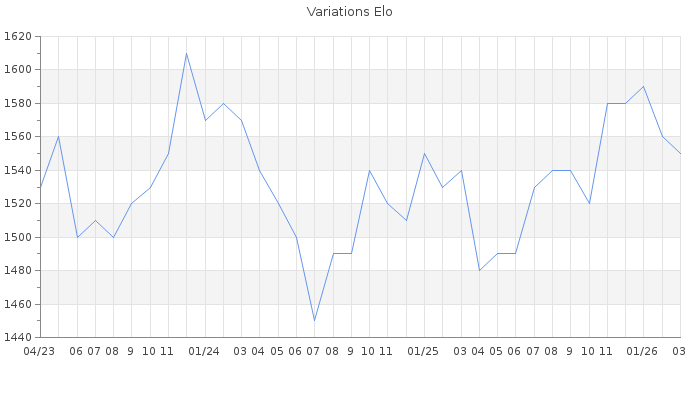 Date d'inscription : 26/12/05. Donateur pour EchecsEmail : Non ( Cliquez ici pour soutenir EchecsEmail. ) Elo non arrondi:1551.6 ( 335 sur 442 joueurs ) Nombre de victoires :640 Nombre de nulles :64 Nombre de défaites :777 Temps de réponse moyen par coup : 0J 6H 32M 49S ( Moyenne sur 727 coups ). Rd ( Un petit rd indique un elo fiable ) : 62 Elo maximum atteint ( en étant classé ) :1730 Elo maximum atteint cette année :1610 Nombre coups joués : 53078 Classement coupe : Inactif Points coupe : 0 Classement Coupe Magic Chess : Inactif Points Coupe Magic Chess : 0 Tournoi échelle : Inactif. Tournois gagnés : 05/02/2026 : Cat 2 : Victoire dans le tournoi n°27391 23/07/2025 : Cat 2 : Victoire dans le tournoi n°26857 14/01/2025 : Cat 2 : Victoire dans le tournoi n°26216 27/10/2024 : Cat 2 : Victoire dans le tournoi n°26123 23/08/2024 : Cat 2 : Victoire dans le tournoi n°25975 23/12/2023 : Cat 2 : Victoire dans le tournoi n°25374 04/08/2023 : Cat 1 : Victoire dans le tournoi n°25032 03/06/2023 : Cat 2 : Victoire dans le tournoi n°24821 25/10/2022 : Cat 2 : Victoire dans le tournoi n°24300 02/10/2022 : Cat 2 : Victoire dans le tournoi n°24279 28/05/2022 : Cat 2 : Victoire dans le tournoi n°23904 25/05/2022 : Cat 2 : Victoire dans le tournoi n°23918 18/02/2022 : Cat 2 : Victoire dans le tournoi n°23598 23/01/2022 : Cat 2 : Victoire dans le tournoi n°23372 07/01/2022 : Cat 2 : Victoire dans le tournoi n°23473 21/12/2021 : Cat 1 : Victoire dans le tournoi n°23414 28/03/2021 : Cat 2 : Victoire dans le tournoi n°22459 21/08/2020 : Cat 2 : Victoire dans le tournoi n°21565 04/08/2020 : Cat 2 : Victoire dans le tournoi n°21411 16/04/2020 : Cat 2 : Victoire dans le tournoi n°20982 28/02/2020 : Cat 2 : Victoire dans le tournoi n°20717 25/02/2020 : Cat 2 : Victoire dans le tournoi n°20807 01/02/2020 : Cat 2 : Victoire dans le tournoi n°20609 16/12/2019 : Cat 2 : Victoire dans le tournoi n°20434 16/04/2017 : Cat 2 : Victoire dans le tournoi n°16283 25/09/2016 : Cat 3 : Victoire dans le tournoi n°15322 08/05/2016 : Cat 1 : Victoire dans le tournoi n°14581 18/01/2016 : Cat 1 : Victoire dans le tournoi n°18846 10/06/2015 : Cat 1 : Victoire dans le tournoi n°17537 24/12/2014 : Cat 1 : Victoire dans le tournoi n°16334 05/11/2008 : Cat 0 : Victoire dans le tournoi n°5114 11/07/2008 : Cat 1 : Victoire dans le tournoi n°5035 Nombre de tournois gagnés :32